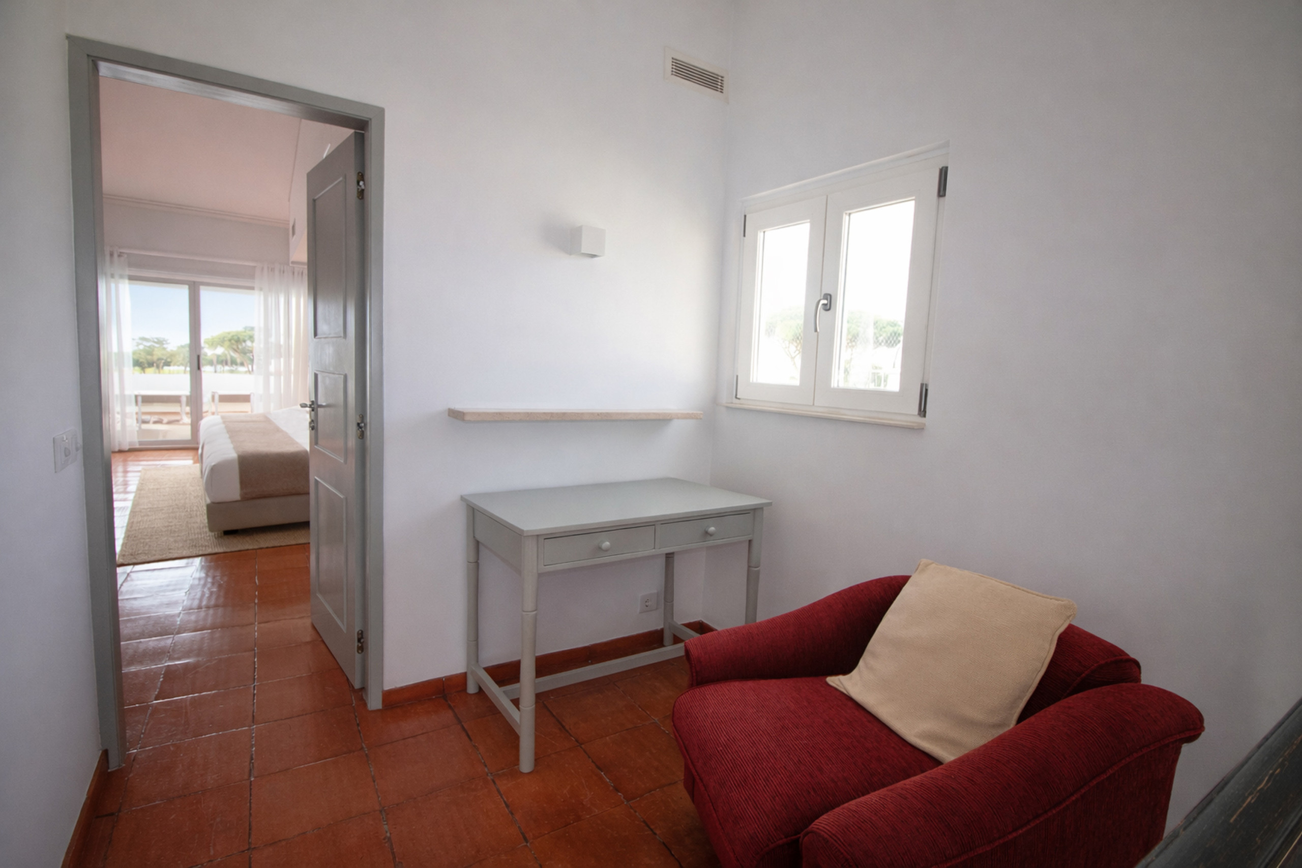 En la planta superior, un pequeño salón de descanso con un sillón y un escritorio crea un rincón tranquilo para trabajar o leer, que conduce a un tercer dormitorio con dos camas individuales unidas como una cama doble y un baño en suite con ducha. Esta habitación se abre a un balcón privado con dos tumbonas y una pequeña mesa auxiliar, ofreciendo hermosas vistas sobre el campo de golf y hasta la playa.