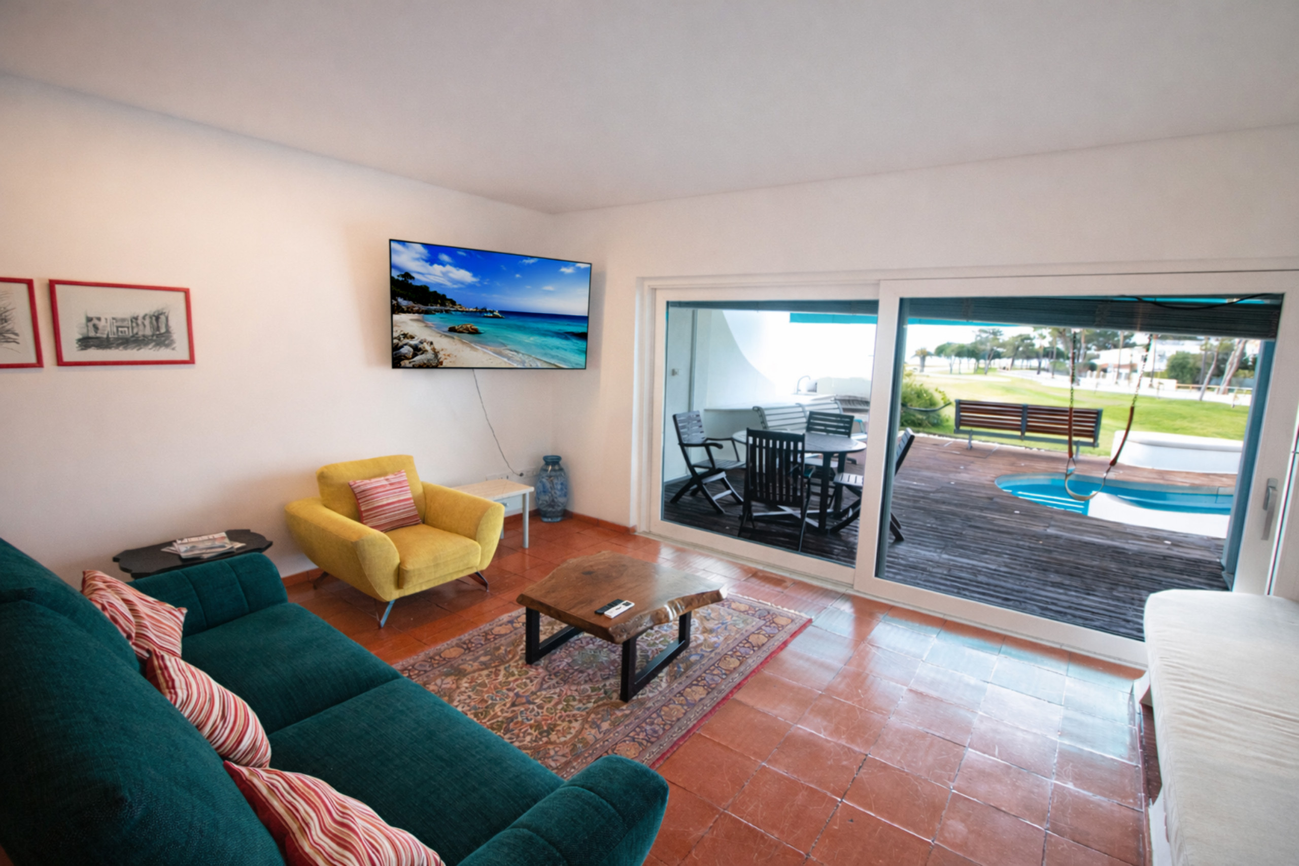 Fuera, la terraza compacta pero acogedora ofrece dos bancos de dos asientos y una mesa para seis personas junto a la barbacoa de carbón y la piscina privada, todo enmarcado por vistas abiertas al campo de golf y la costa. El aparcamiento está en la calle, a pocos metros de la propiedad, lo que hace que las llegadas y los días de salida sean sencillos.