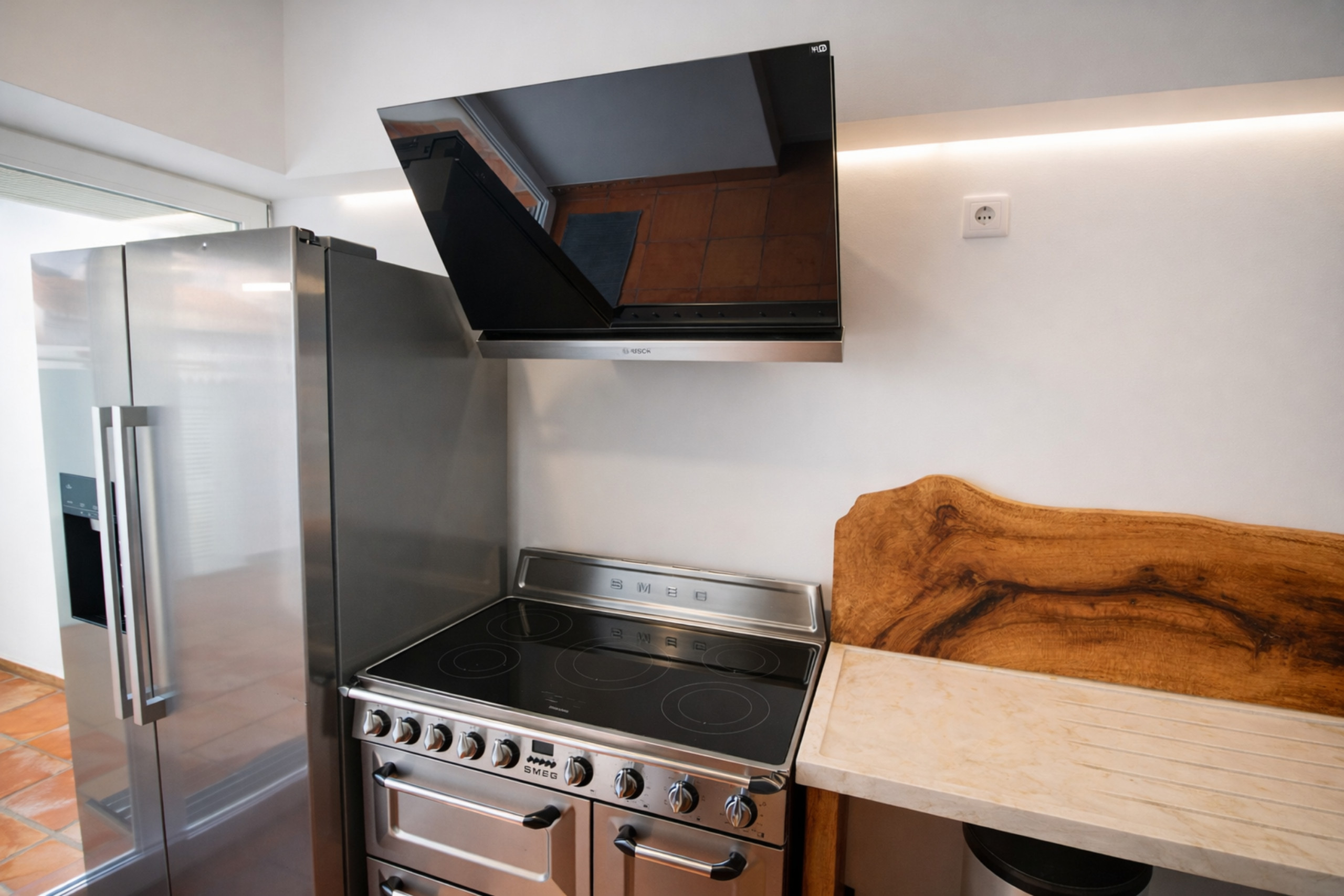 Pase a un área de estar y comedor luminosa dividida en dos espacios acogedores: un salón acogedor con un sofá de tres plazas, un sofá de hormigón integrado de tres plazas junto a la chimenea y la TV cerca de las puertas de la terraza, y una zona de comedor con una mesa para seis personas. La cocina compacta de planta abierta está completamente equipada para cocinar fácilmente en casa, y justo fuera hay una pequeña despensa con la lavadora. Un aseo de invitados conveniente está ubicado cerca de la entrada, cerca de la cocina y la sala de estar.