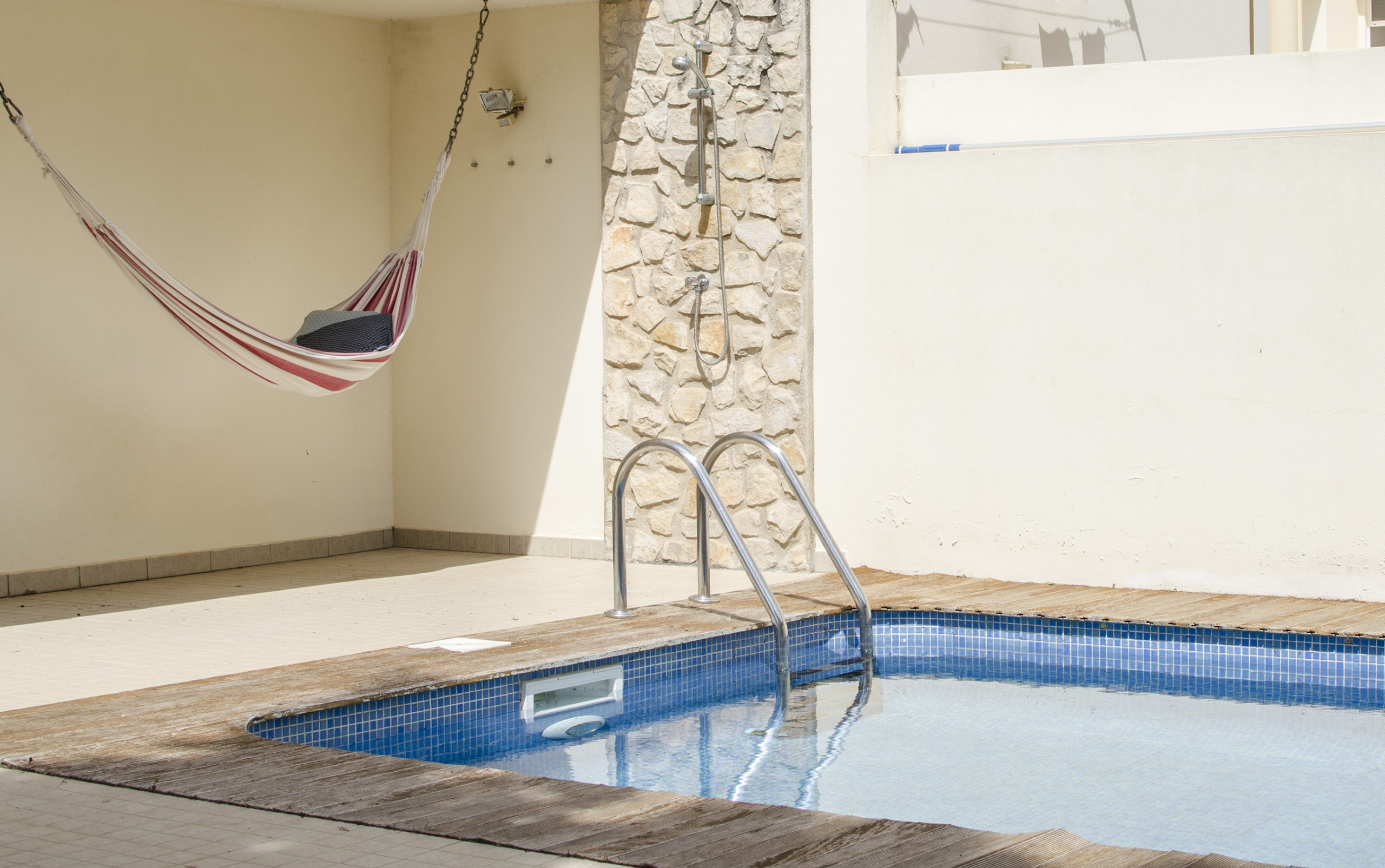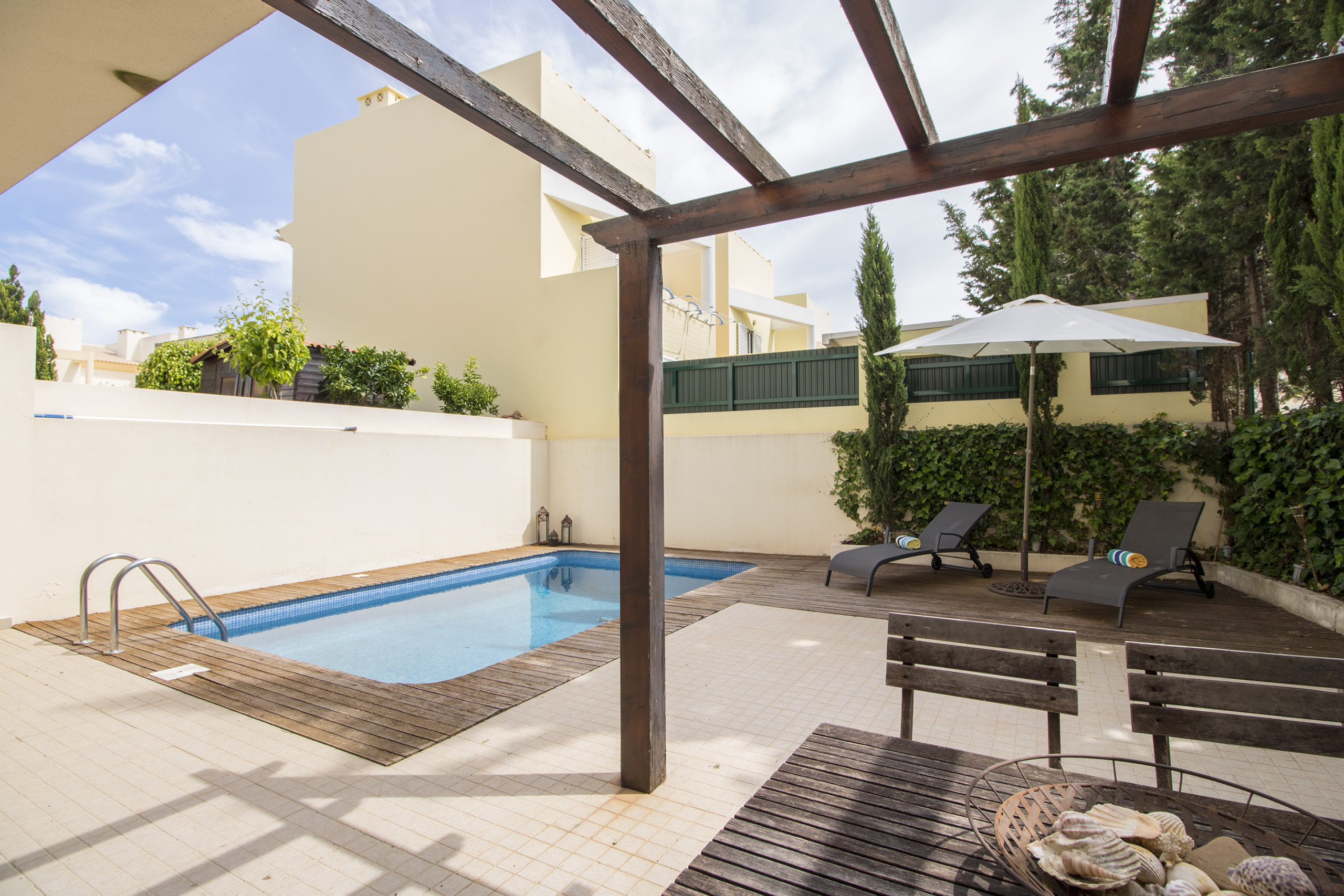 Fuera, encontrarás una piscina privada de aproximadamente 6 × 3 metros (1-1,8 m de profundidad), con tumbonas y una red mecedora donde podrás relajarte y tomar el sol del Algarve. Una barbacoa de carbón y un juego de comedor al aire libre para seis personas, ubicados bajo un área sombreada, crean un rincón acogedor para comidas al fresco relajadas. Hay plazas de aparcamiento justo fuera de la propiedad para mayor comodidad.
