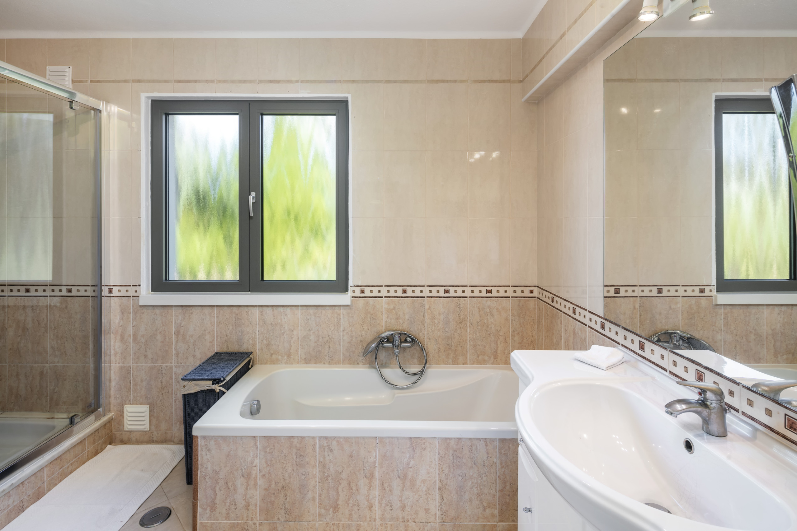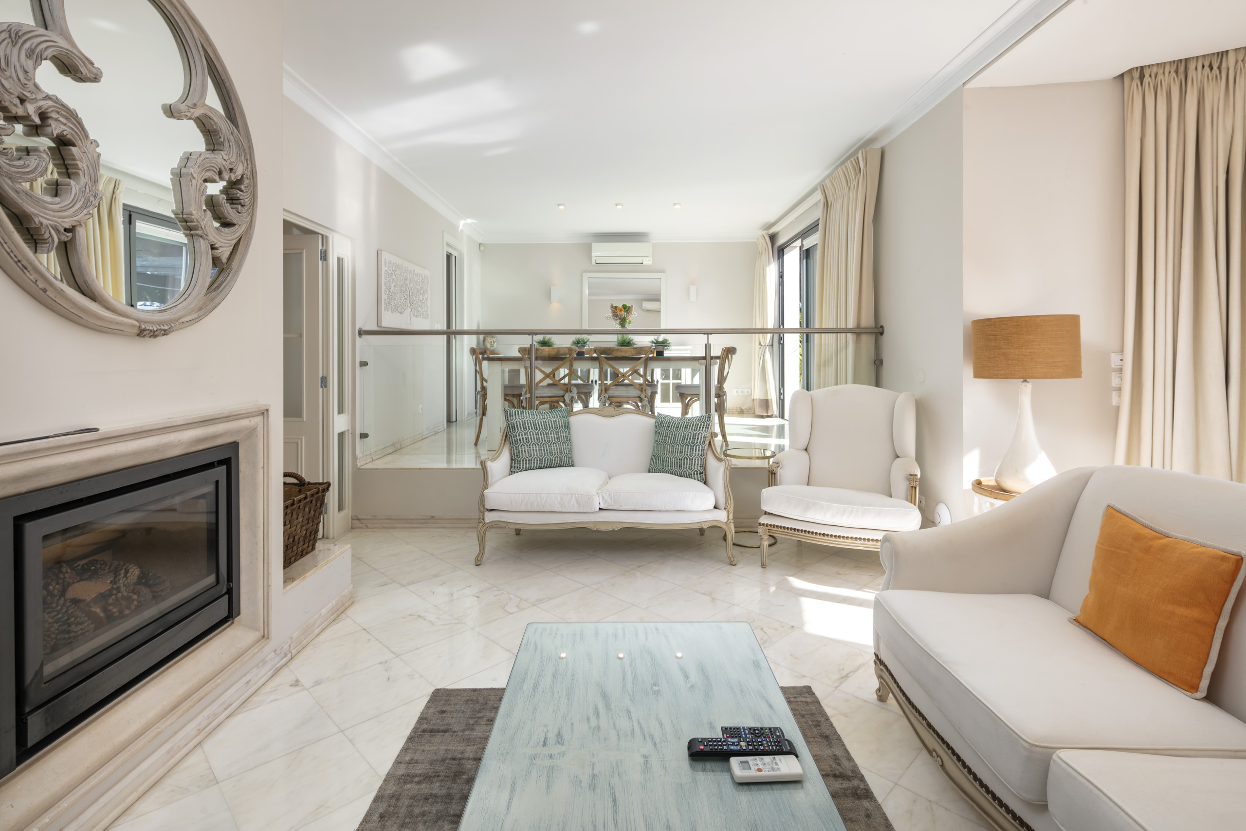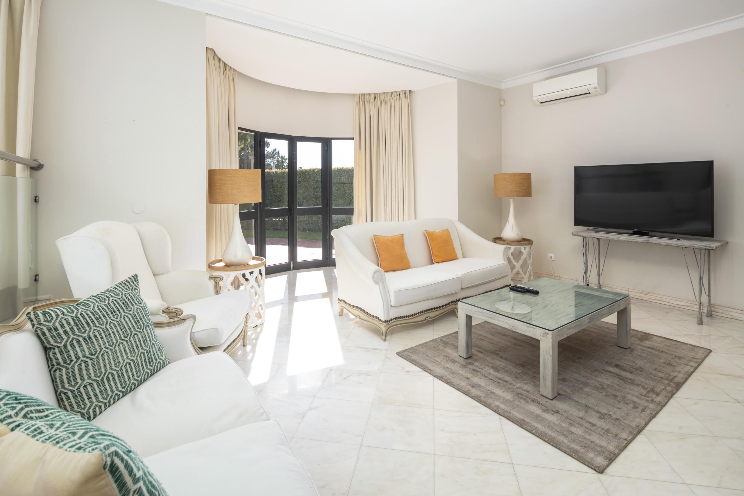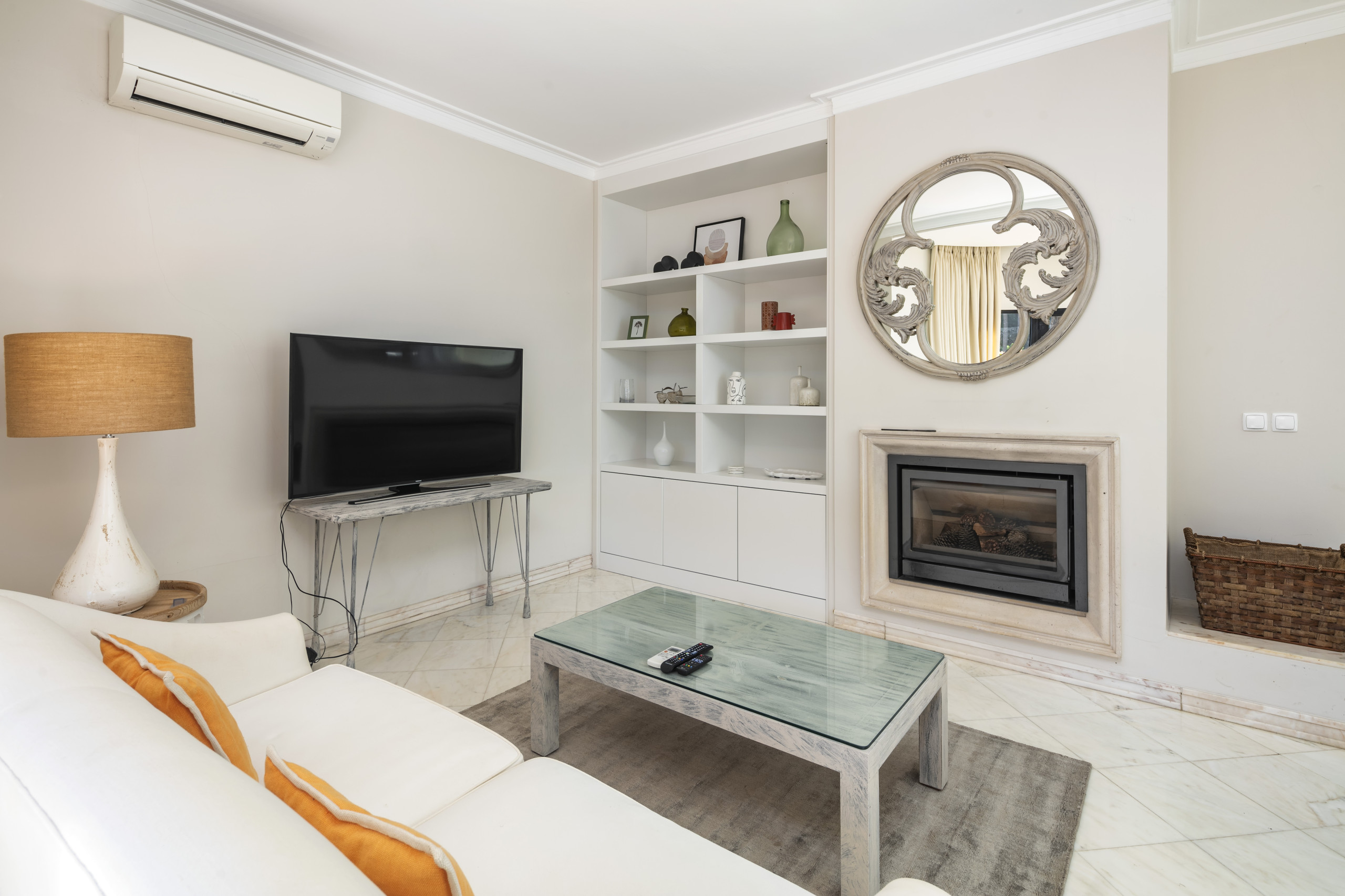 Desde la entrada, unos escalones conducen al salón, que está amueblado con amplios y cómodos asientos de sofá, una chimenea decorativa, aire acondicionado de tipo split y una gran televisión de pantalla plana que muestra una amplia variedad de canales en inglés, incluyendo BBC, ITV, Sky Sports y TNT Sports. Las puertas de patio se abren a la terraza junto a la piscina y al jardín.