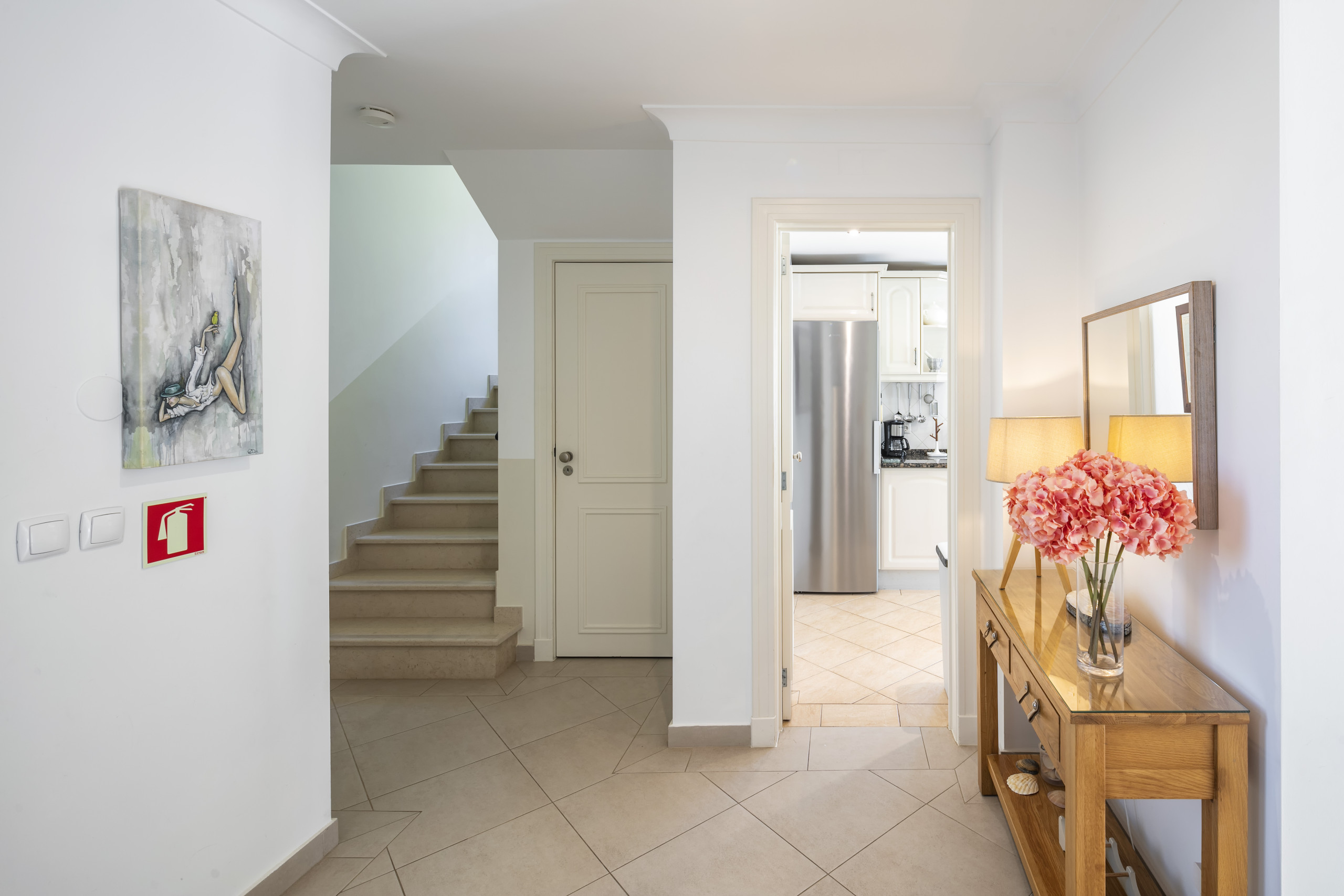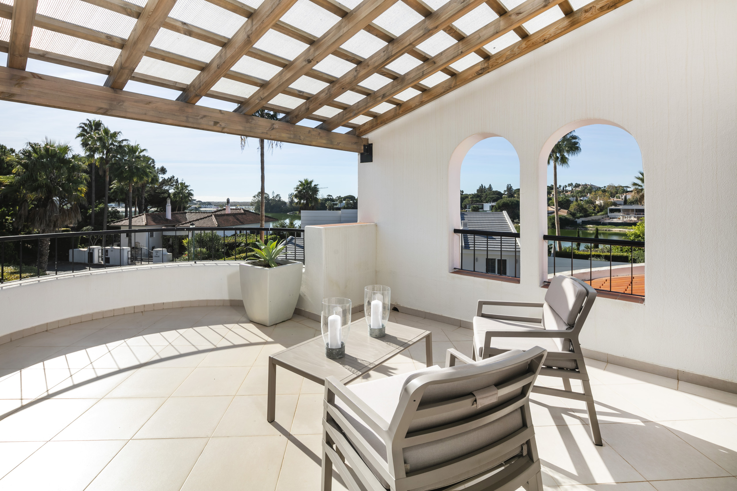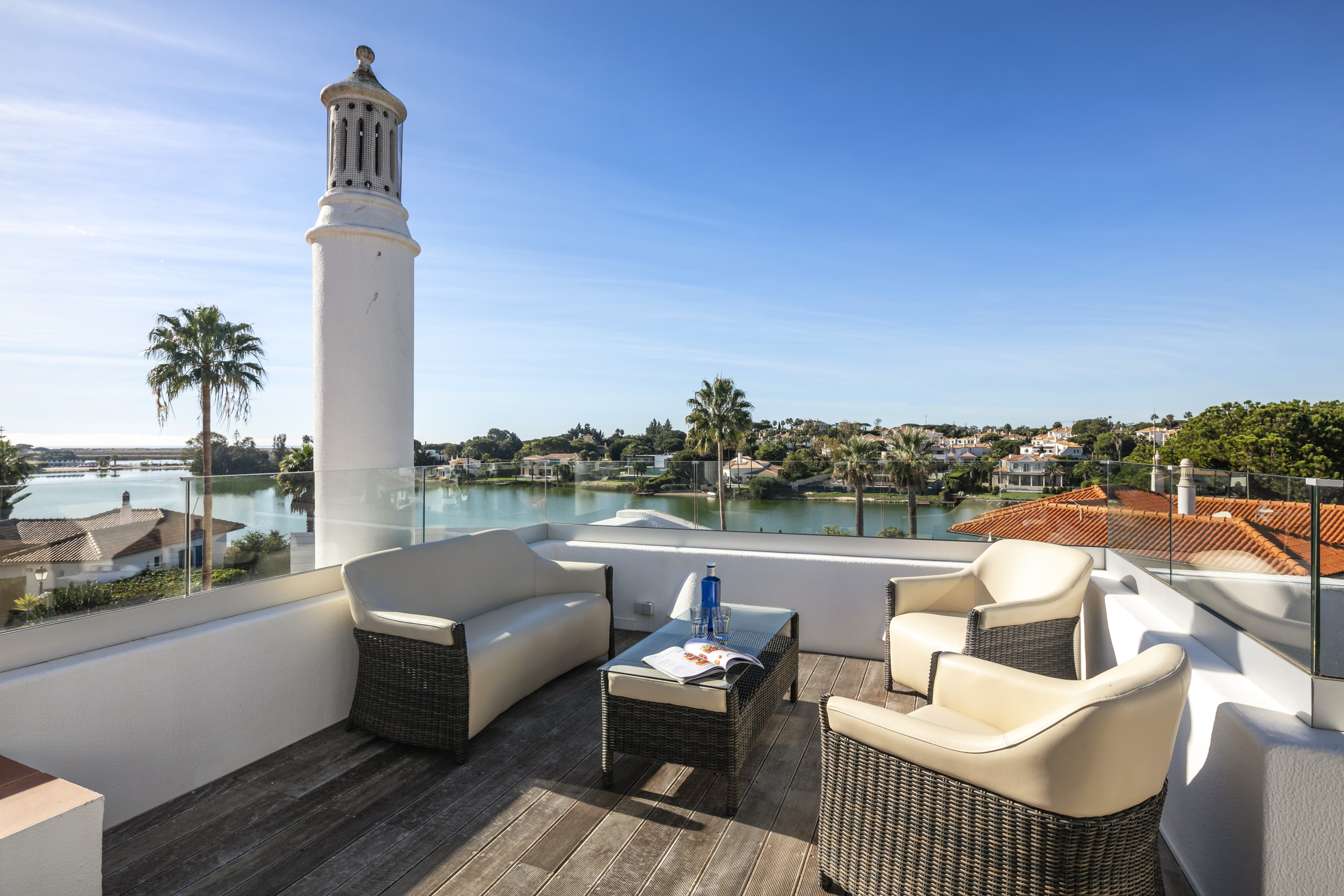 El acceso a la terraza en la azotea está convenientemente ubicado dentro de la propiedad. Este espacio acogedor está amueblado con asientos de sofá de ratán, proporcionando un lugar cómodo para relajarse mientras se disfruta de las impresionantes vistas del lago Quinta do Lago cercano.