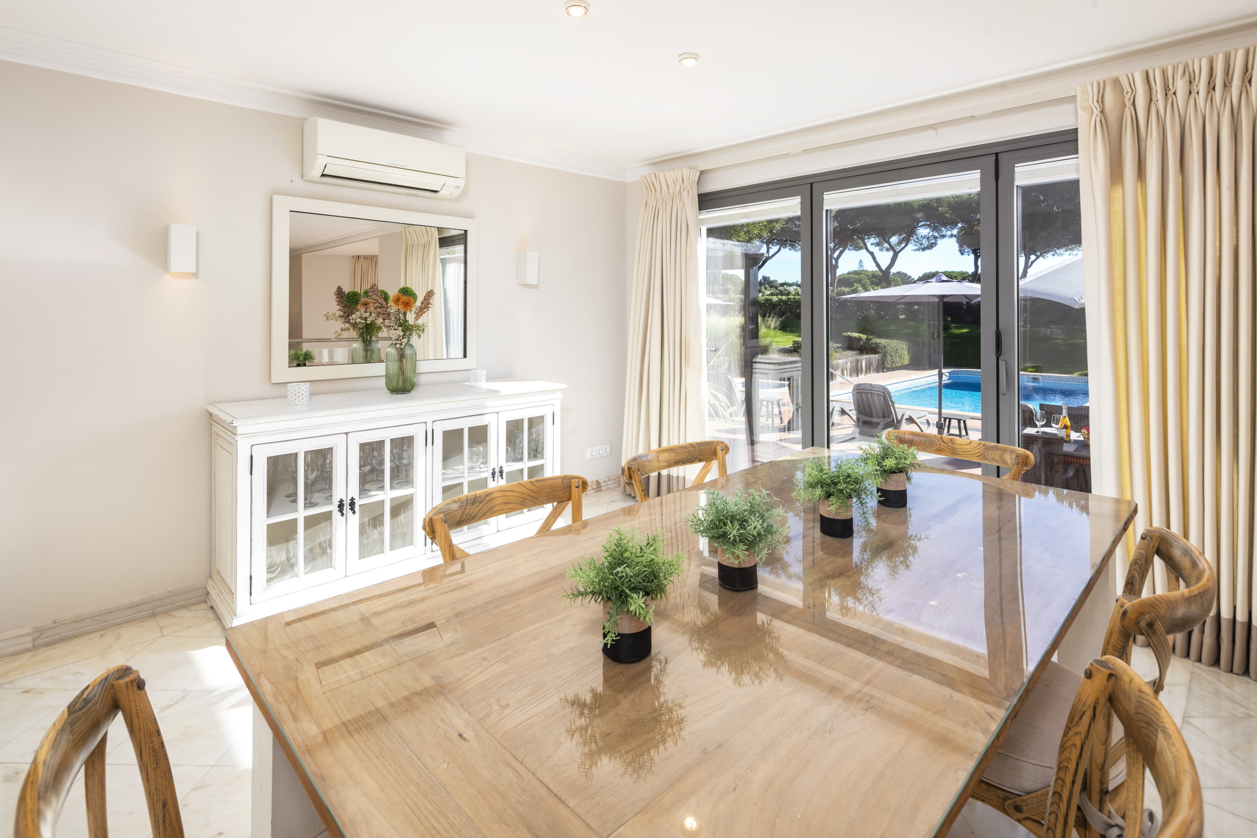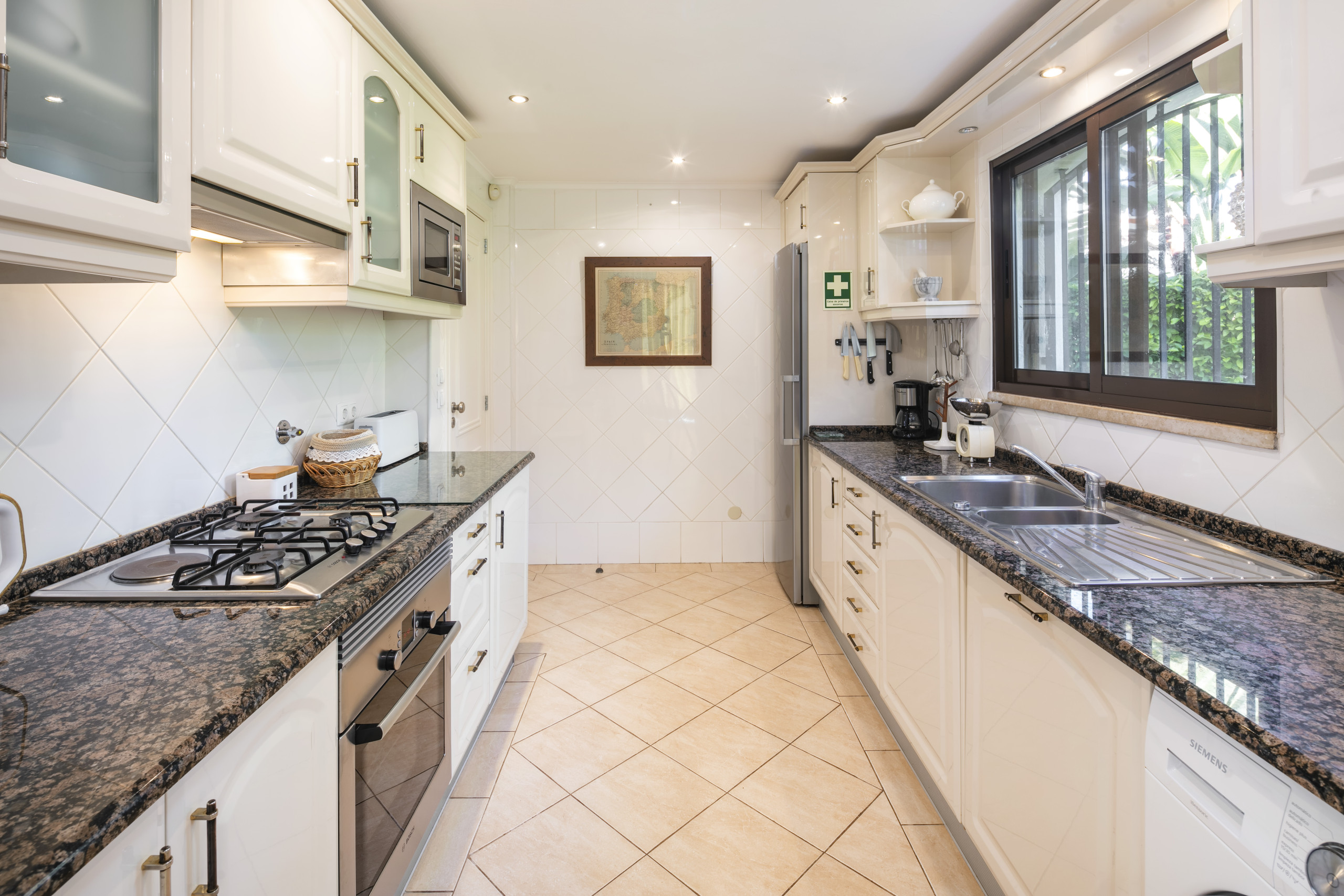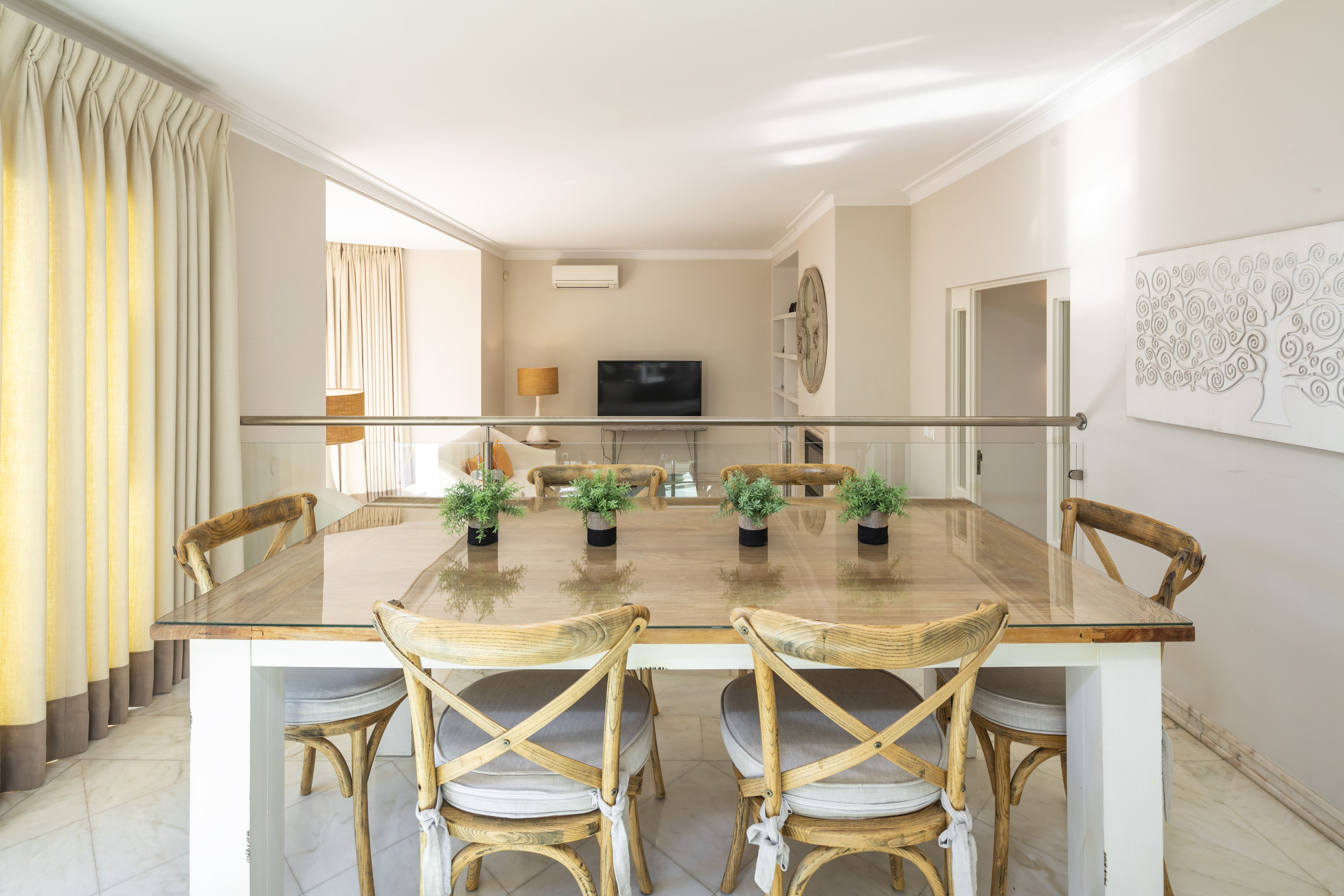 La cocina moderna está completamente equipada con una amplia gama de electrodomésticos, incluyendo un frigorífico, lavadora, lavavajillas, tres fuegos de gas y un fuego eléctrico, campana extractora, tostadora, hervidor, máquina de café Nespresso, máquina de hielo, exprimidor, batidora y microondas. Una puerta corredera de la cocina se abre al comedor, que cuenta con una mesa con asientos para seis. Desde el comedor, las puertas de patio proporcionan acceso directo a la terraza junto a la piscina.