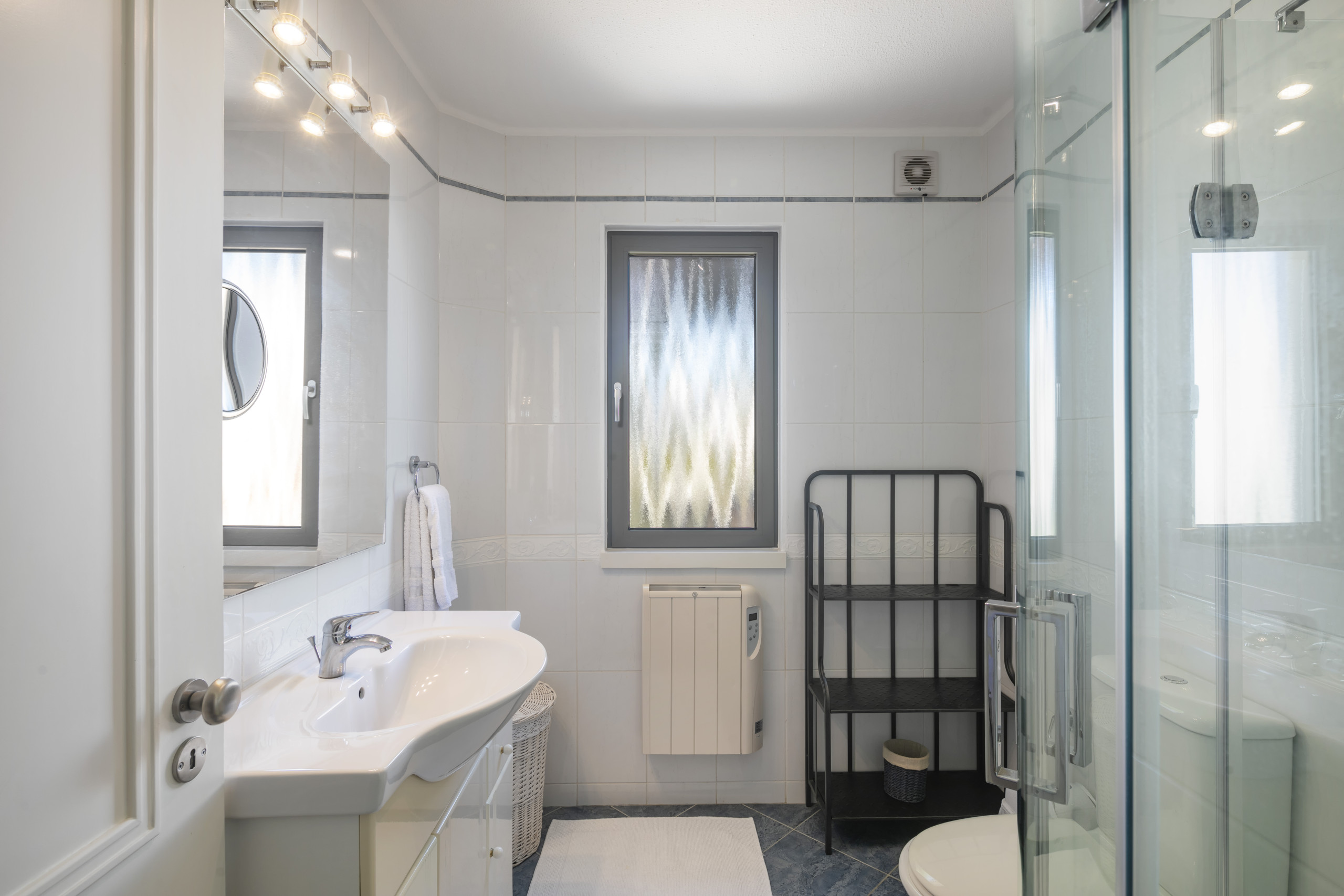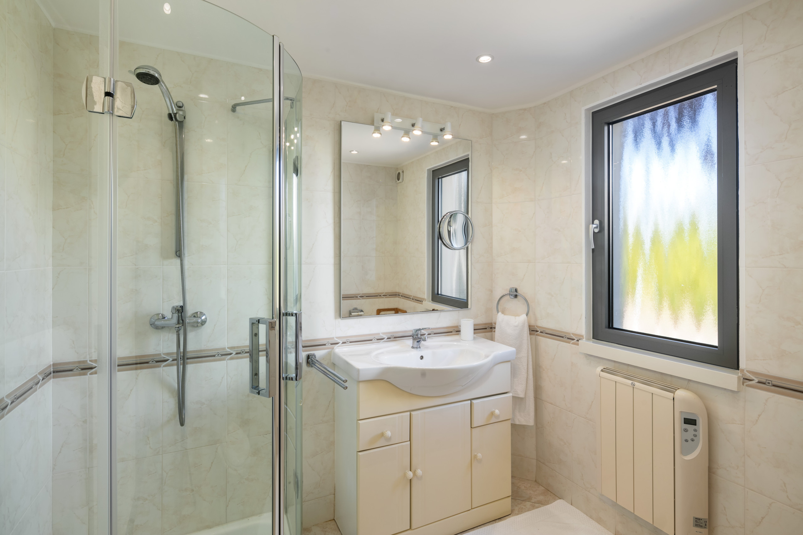 Las escaleras conducen a los dormitorios dos y tres. El dormitorio dos es una habitación con dos camas con aire acondicionado de unidad dividida, armarios empotrados, una caja fuerte y un cuarto de baño en suite con ducha de paseo y toallero calefactable. Las puertas de patio se abren a una terraza superior compartida con el dormitorio tres, que tiene vistas al lago. El dormitorio tres es una habitación doble con aire acondicionado de unidad dividida, un cuarto de baño en suite con toallero calefactable y puertas de patio que conducen a la terraza superior compartida con el dormitorio dos.
