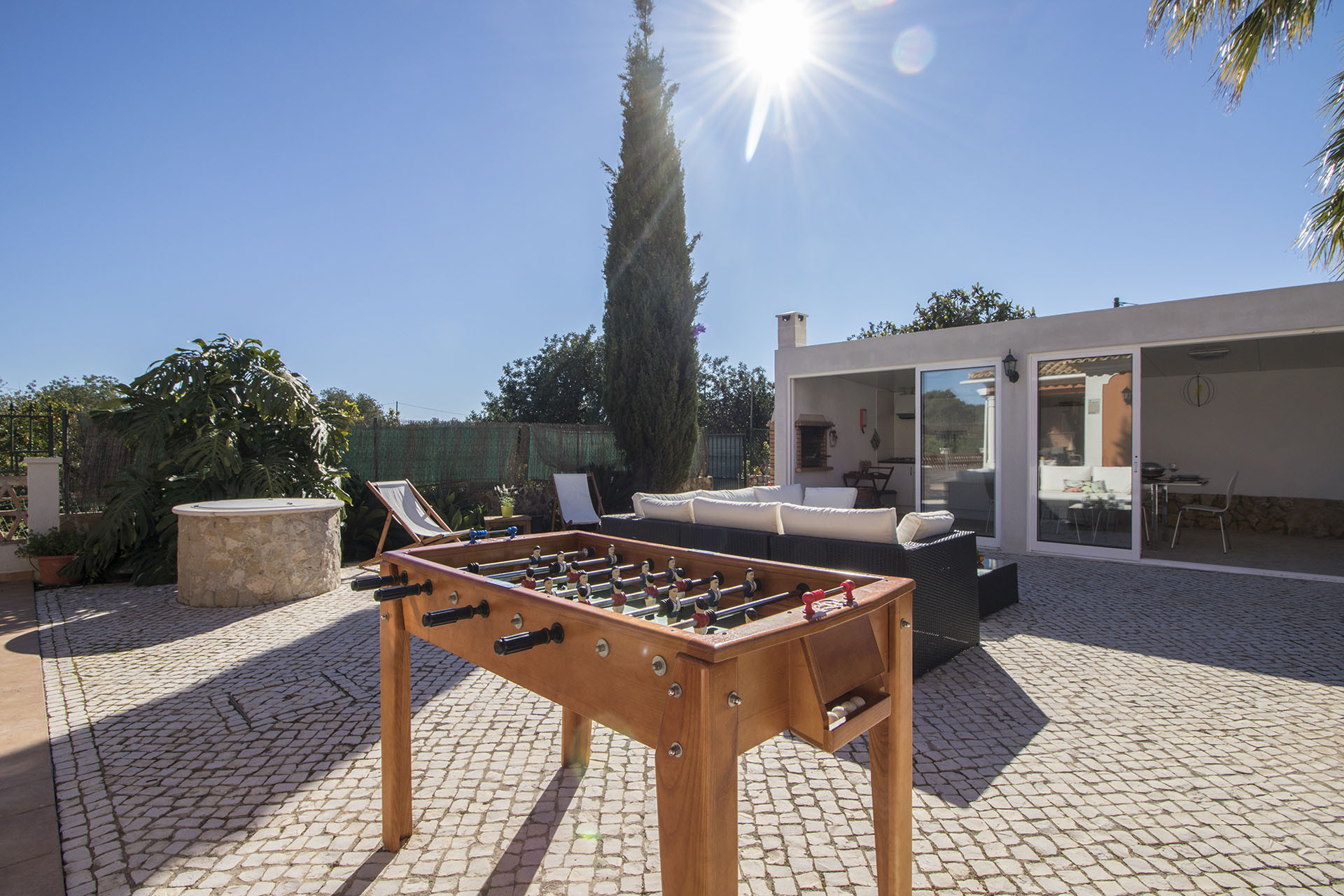 El césped cuenta con columpios y otros juguetes que se benefician de la sombra natural de las palmeras, un lugar ideal para que los niños se diviertan. Los muebles de exterior hacen del jardín un espacio relajante y agradable para toda la familia. El futbolín y el ping-pong serán un deleite para nuestros huéspedes y un nuevo anexo cubierto al aire libre respaldado por una cocina moderna y práctica permite realizar excelentes barbacoas y comidas de verano.
