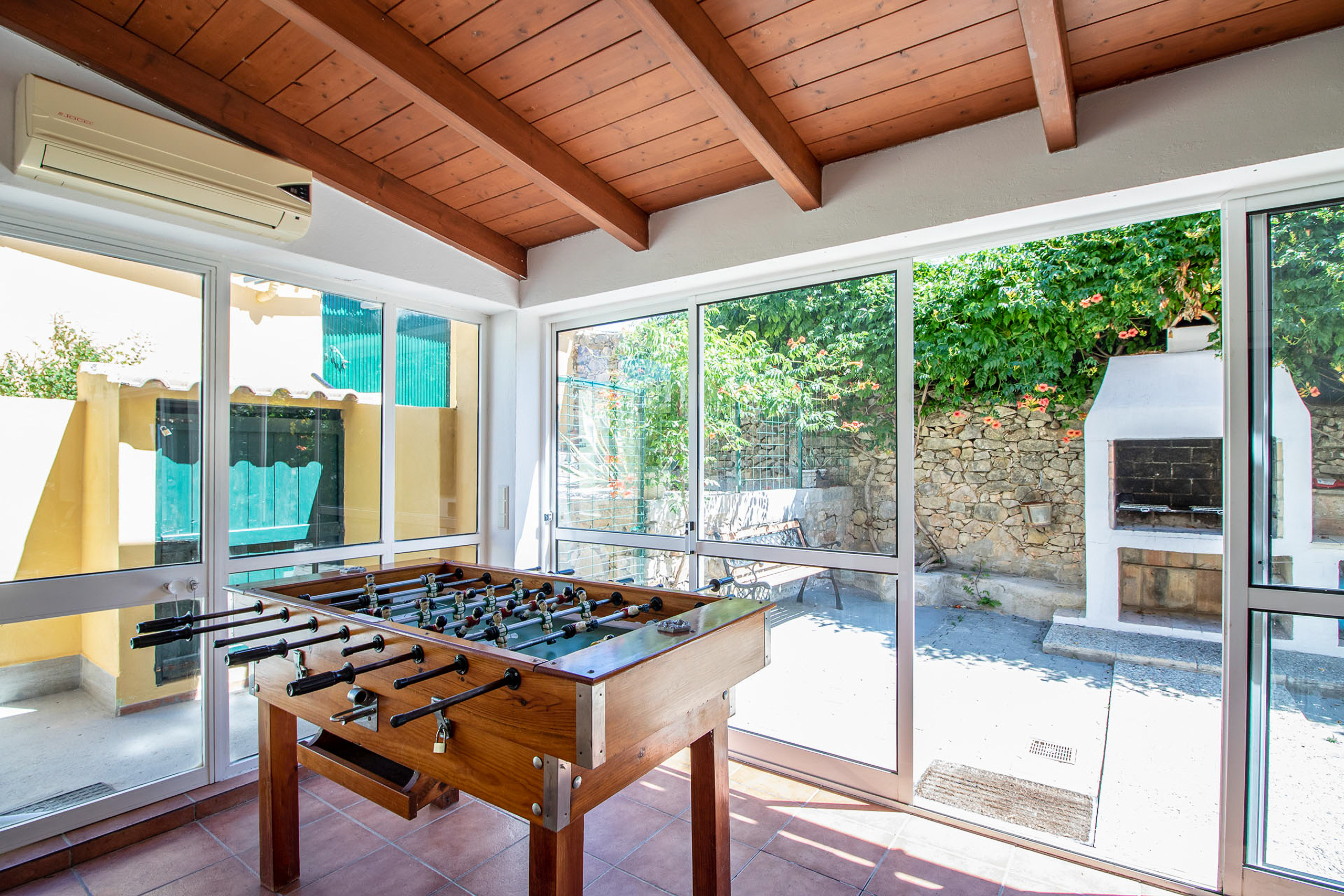Fuera, los huéspedes disfrutan de la privacidad y el sol durante todo el día alrededor de la piscina de 10 x 5 m, mientras que una barbacoa de carbón y un acogedor patio cerrado con mesa de comedor y futbolín justo a su lado se convierten en los lugares de reunión naturales para aperitivos, juegos y charlas nocturnas entre chapuzones en la piscina.