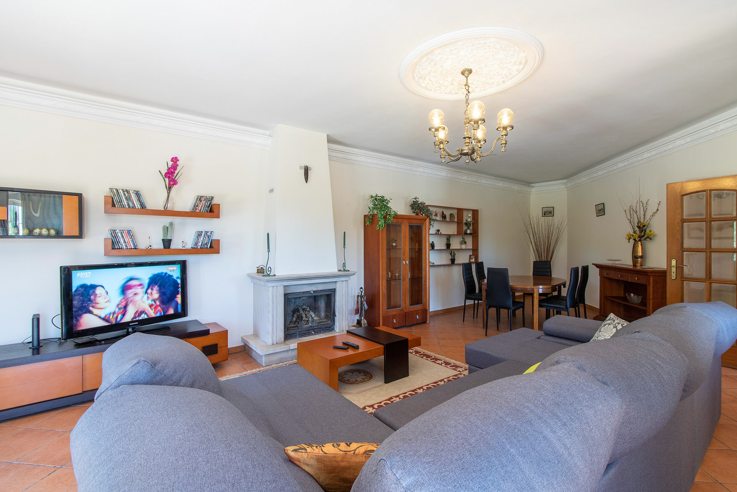 El salón luminoso cuenta con una mesa de comedor para seis personas, un sofá cómodo de 4 plazas con chaise longue, chimenea y televisión, con fácil acceso al área exterior para una vida interior-exterior relajada.