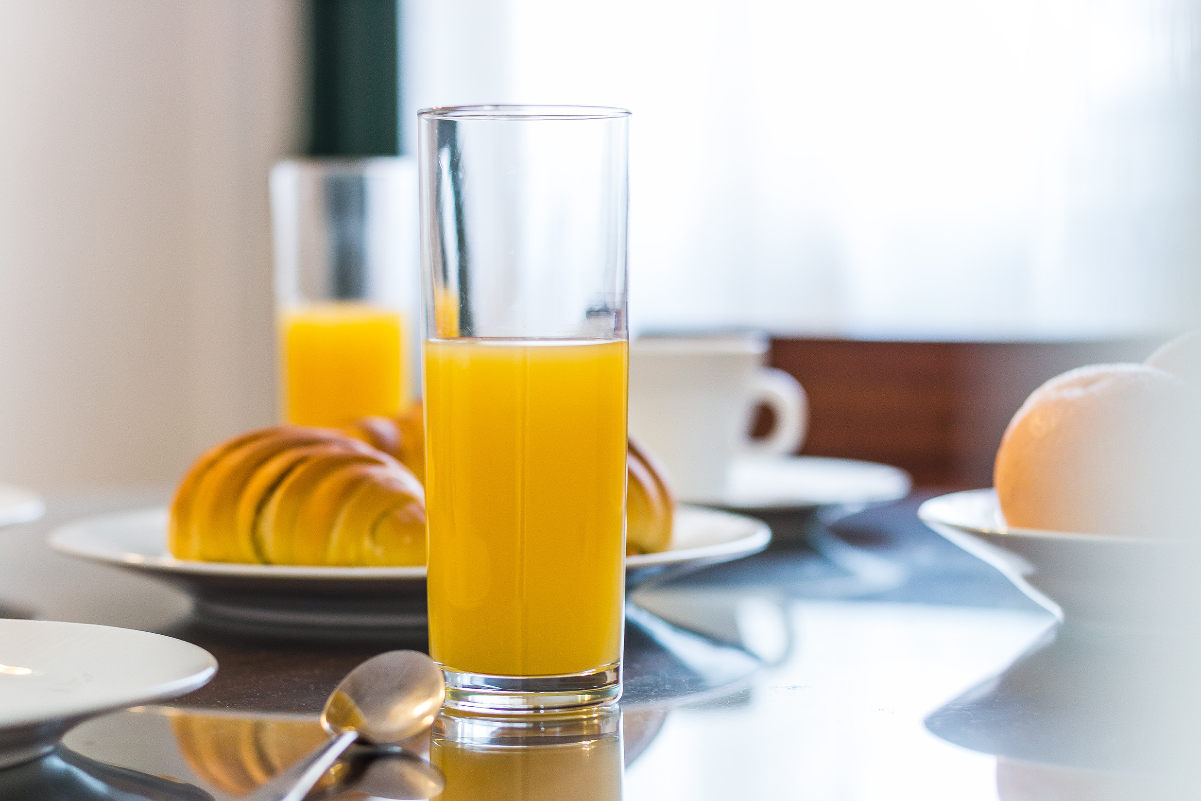 Eau minérale, fruits frais (fruits de saison + bananes + oranges + pommes), pain frais pour chaque convive, jus d'orange, beurre, fromage, jambon.