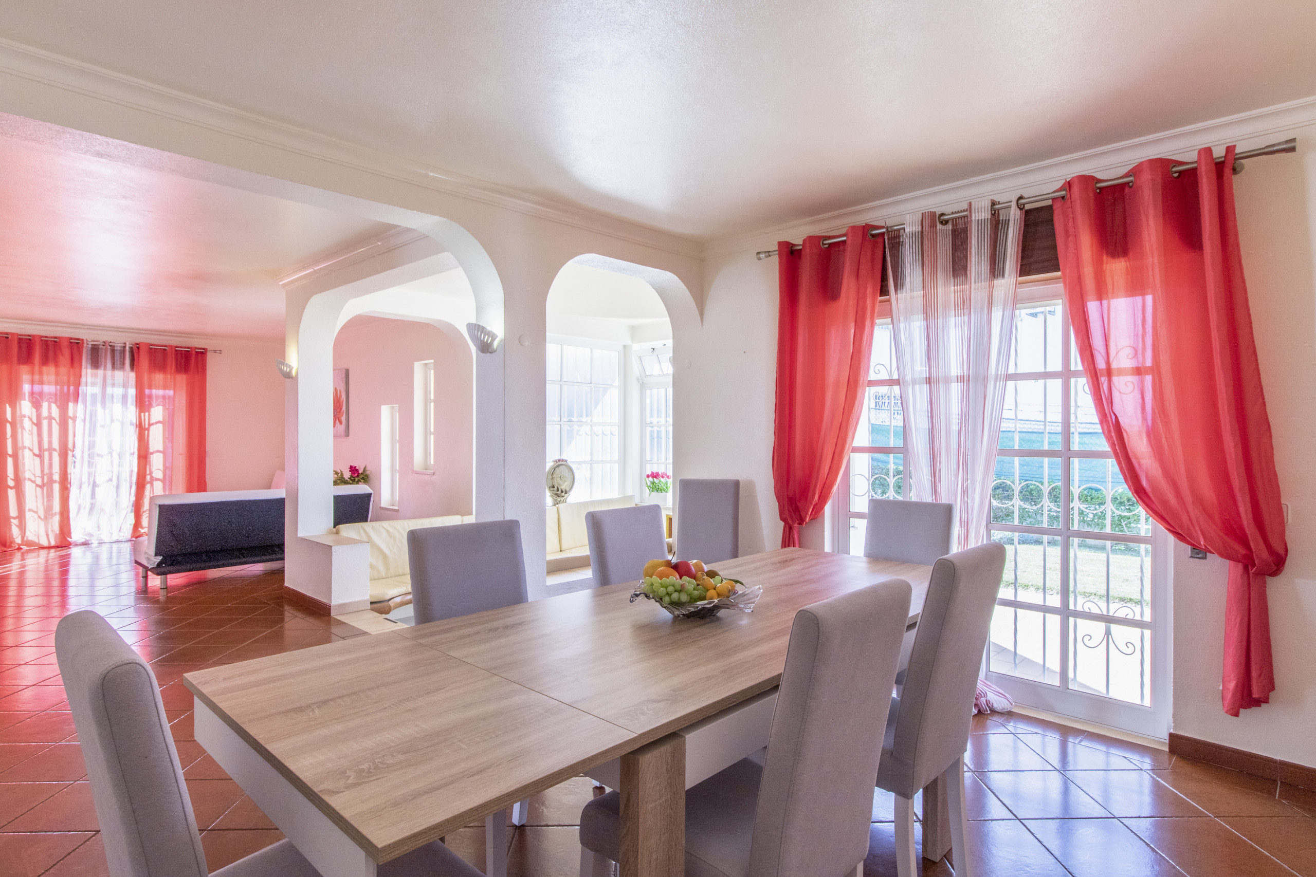 La cuisine indépendante est compacte et pratique, équipée d'une plaque de cuisson, d'un four, d'un micro-ondes, d'un lave-vaisselle et d'un réfrigérateur, vous permettant de préparer des en-cas simples comme des repas familiaux décontractés. Le salon propose un petit canapé et une télévision, et juste à côté se trouve la salle à manger où tout le monde peut manger ensemble. À quelques marches de là, un espace de style mauresque crée un coin douillet pour s'asseoir, discuter et se détendre après une journée à la plage.