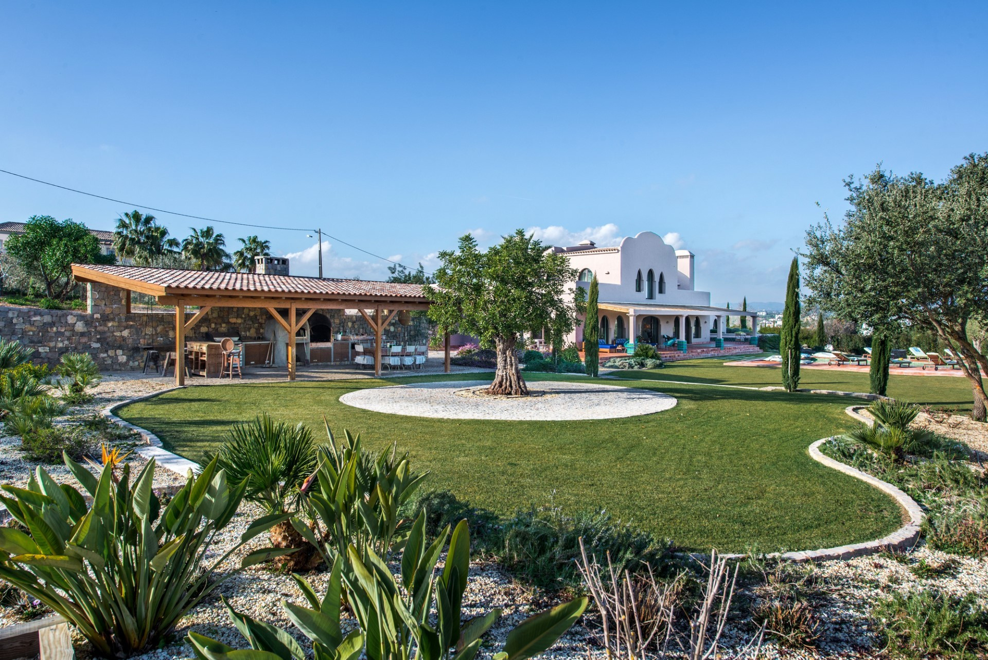 Il y a des terrasses couvertes et non couvertes, un patio fermé et une cuisine d'été bien équipée au milieu de jardins d'oliviers.