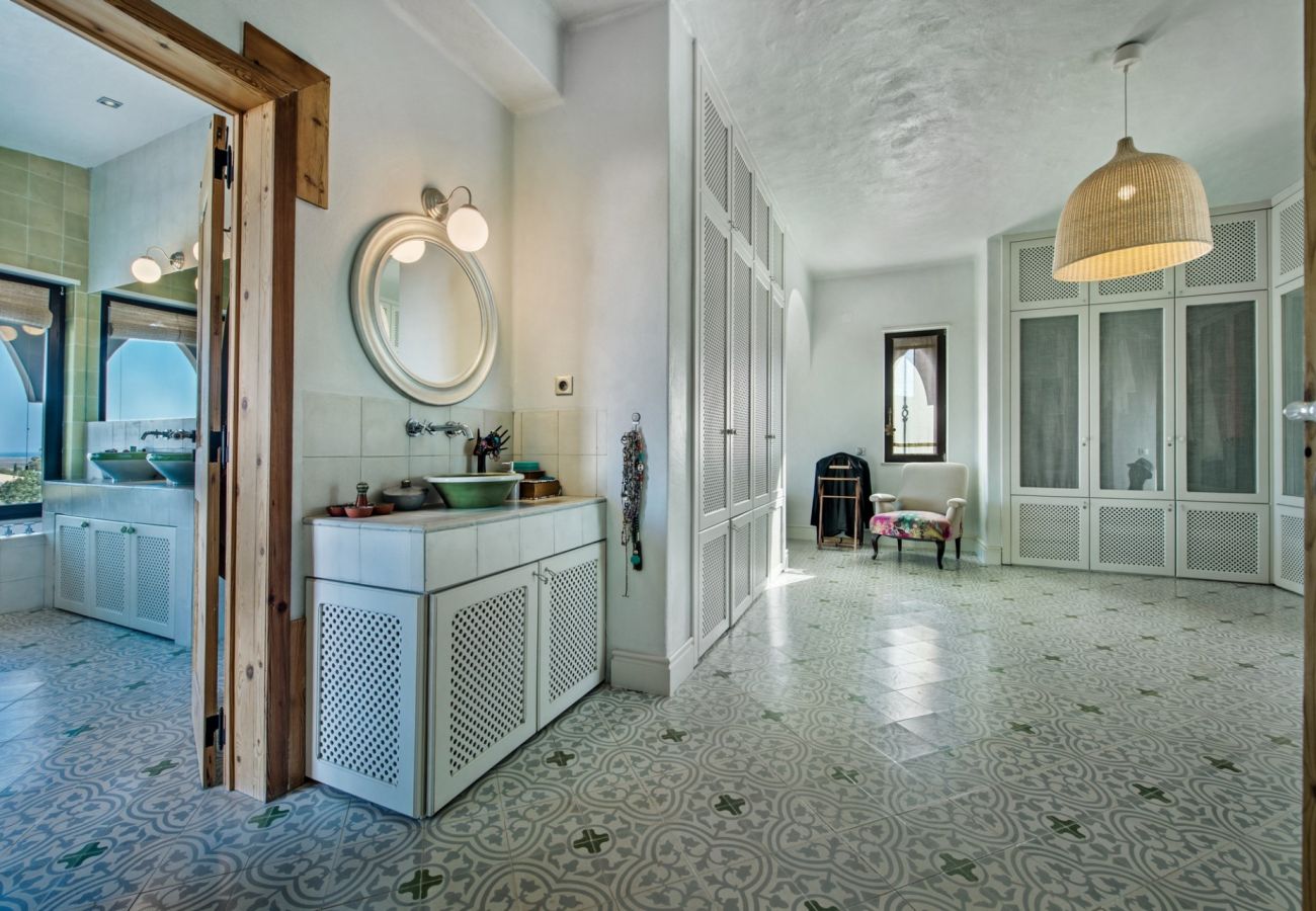 Le dressing mène à travers une arche à la zone de couchage avec un lit king-size. De là, une grande terrasse privée avec un escalier extérieur menant au jardin et à la piscine.