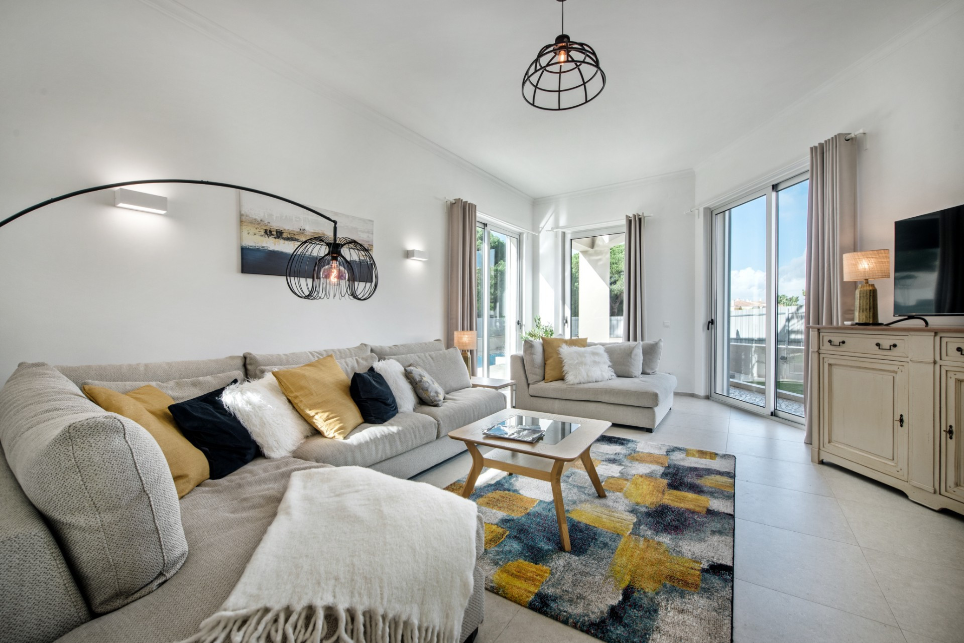 Chiq TV avec chaînes Lazer, air conditionné, 2 canapés et portes-fenêtres donnant sur le jardin et la piscine.