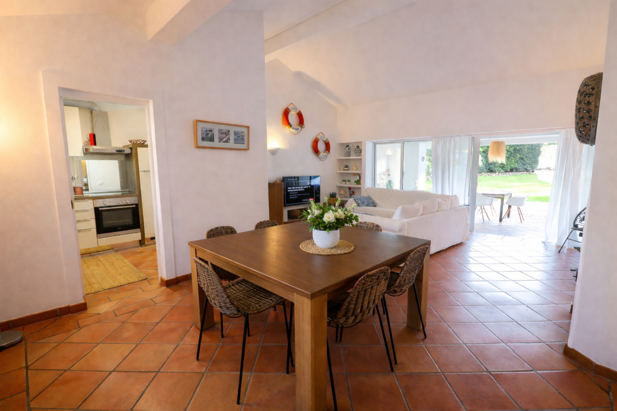 Inside, the living room is a cosy space to unwind, featuring comfortable sofas and armchairs, a fireplace, a large-screen TV with cable channels and unlimited Wi-Fi, making it ideal for quiet evenings, reading or working remotely. The fully equipped kitchen, with a small dining area and direct connection to the dining room, makes everyday cooking easy and sociable. Cosy blankets are provided throughout the house, and additional portable heaters are available on request to ensure extra comfort during cooler winter days.