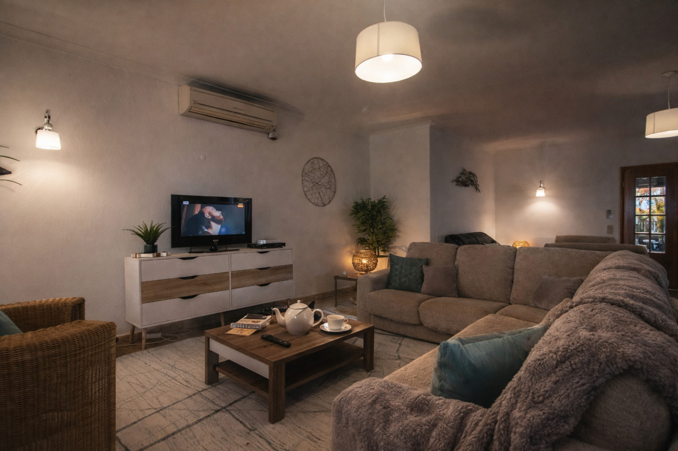 Inside, the living room feels truly welcoming, with comfortable seating, a TV and a cosy setting for evenings in with family or friends. The fully equipped kitchen makes everyday cooking easy, whether preparing home-cooked meals or enjoying long, relaxed dinners together. For added indoor entertainment, the villa also features a games room with a pool table and table football, ideal for cooler winter days. Cosy blankets are provided, and additional portable heaters are available on request to ensure extra comfort during your stay.