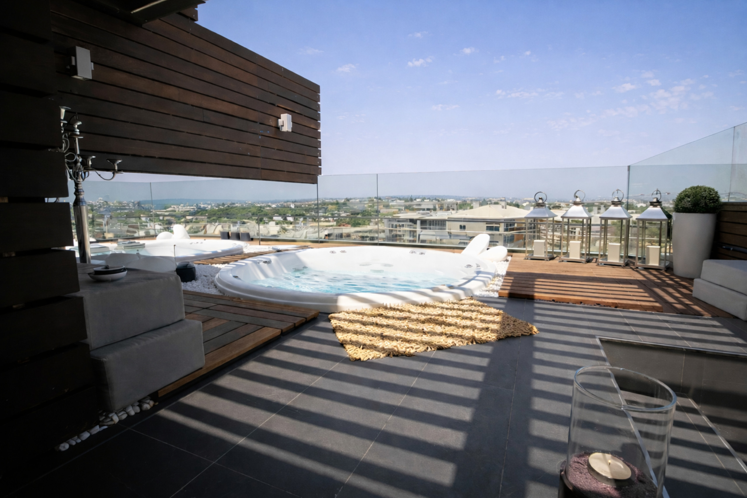 No interior, o penthouse apresenta uma área de estar e jantar ampla e luminosa com assentos confortáveis, uma televisão de ecrã plano e acesso direto a uma varanda abrigada, criando um ambiente acolhedor para serões tranquilos, leitura ou trabalho remoto. O quarto duplo elegante é igualmente convidativo, com a sua própria televisão, estores elétricos e acesso direto à varanda. A cozinha moderna e totalmente equipada torna a confeção de refeições diárias fácil, seja para preparar refeições simples ou desfrutar de jantares descontraídos em casa. Mantas acolhedoras são fornecidas, e aquecedores portáteis adicionais estão disponíveis a pedido para maior conforto no inverno.