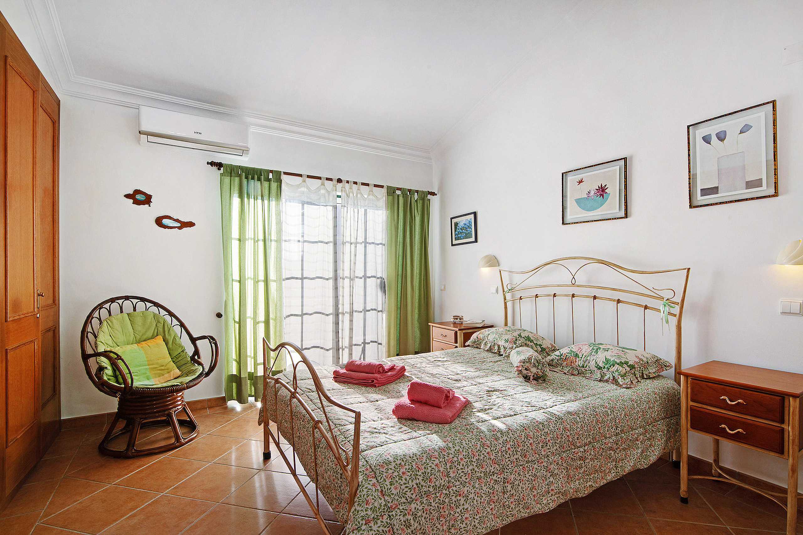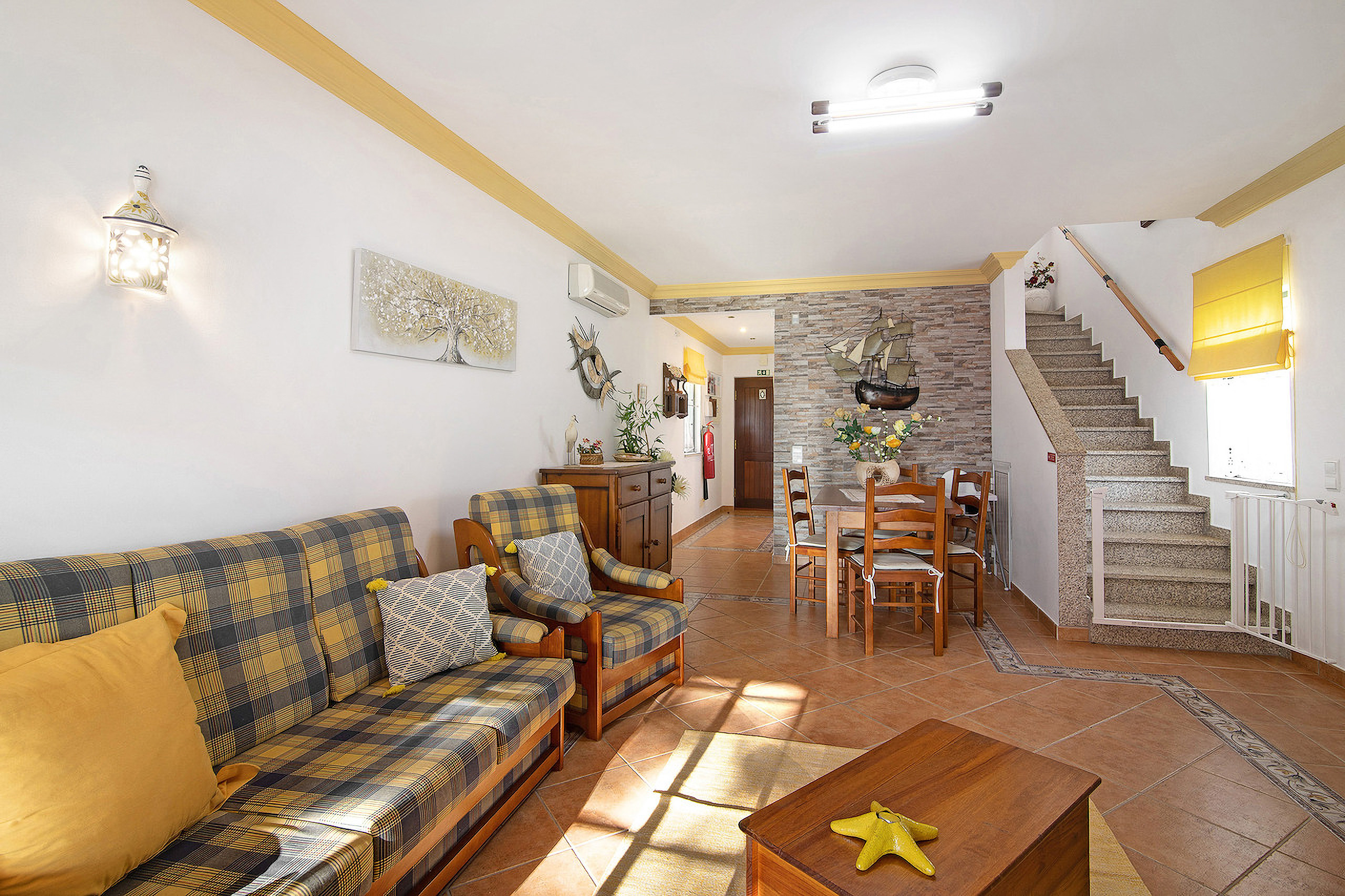 No interior, encontra dois quartos duplos com ar condicionado — um com casa de banho com duche, outro com banheira — garantindo espaço privado e confortável para todos, sem filas de manhã. A cozinha totalmente equipada tem todos os utensílios para refeições familiares fáceis, enquanto a sala de estar oferece dois sofás confortáveis, sofá-cama de casal, TV, Wi‑Fi e mesa de jantar para momentos descontraídos.