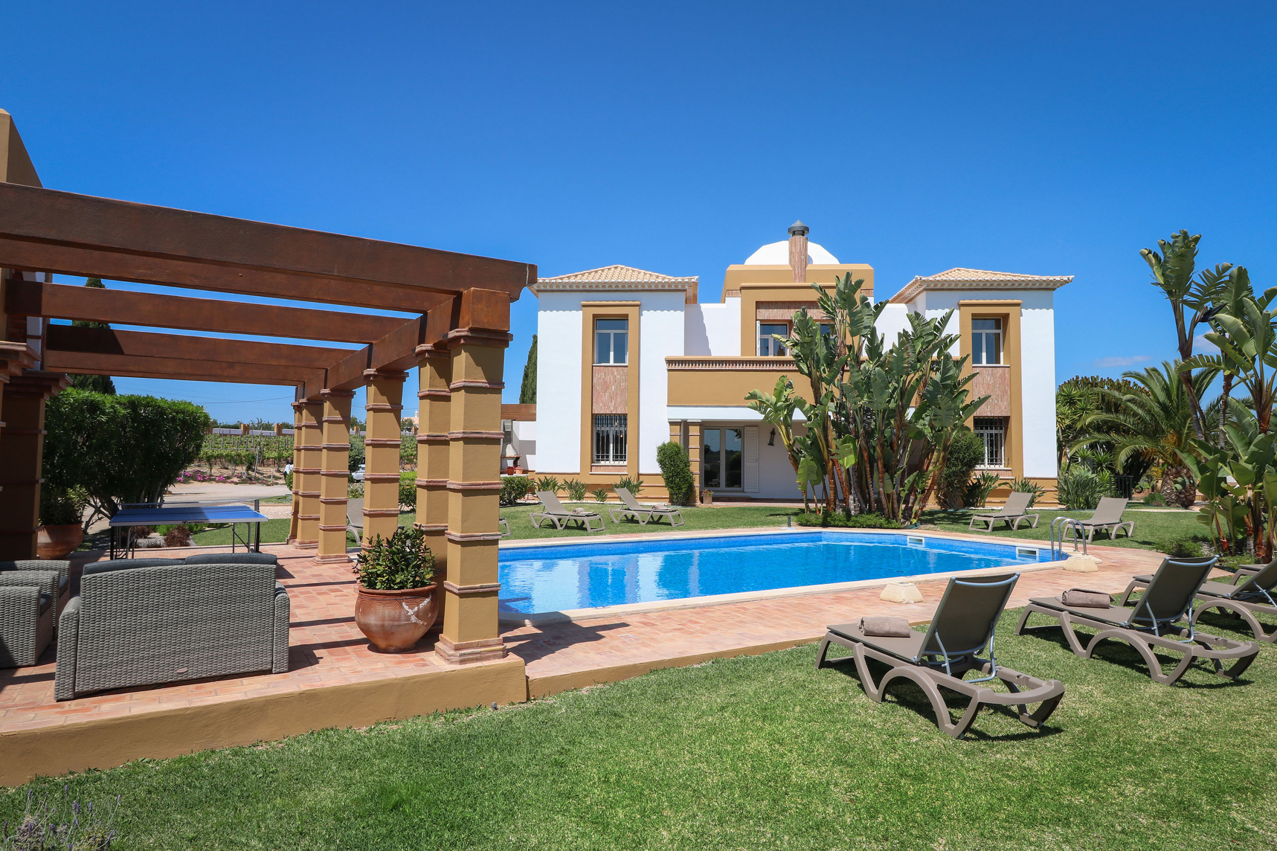 O exterior da moradia é magnifico, com uma vinha enorme, as inúmeras estrelícias e palmeiras e a relva ao redor da piscina dão-lhe um ar tropical, dispõe de uma piscina de excelentes dimensões, com 12 metros de comprimento por 6 de largura e profundidade entre 1 metro e 2,2 metros. A piscina tem a possibilidade de ser aquecida somente entre Abril e Outubro (mediante taxa extra).