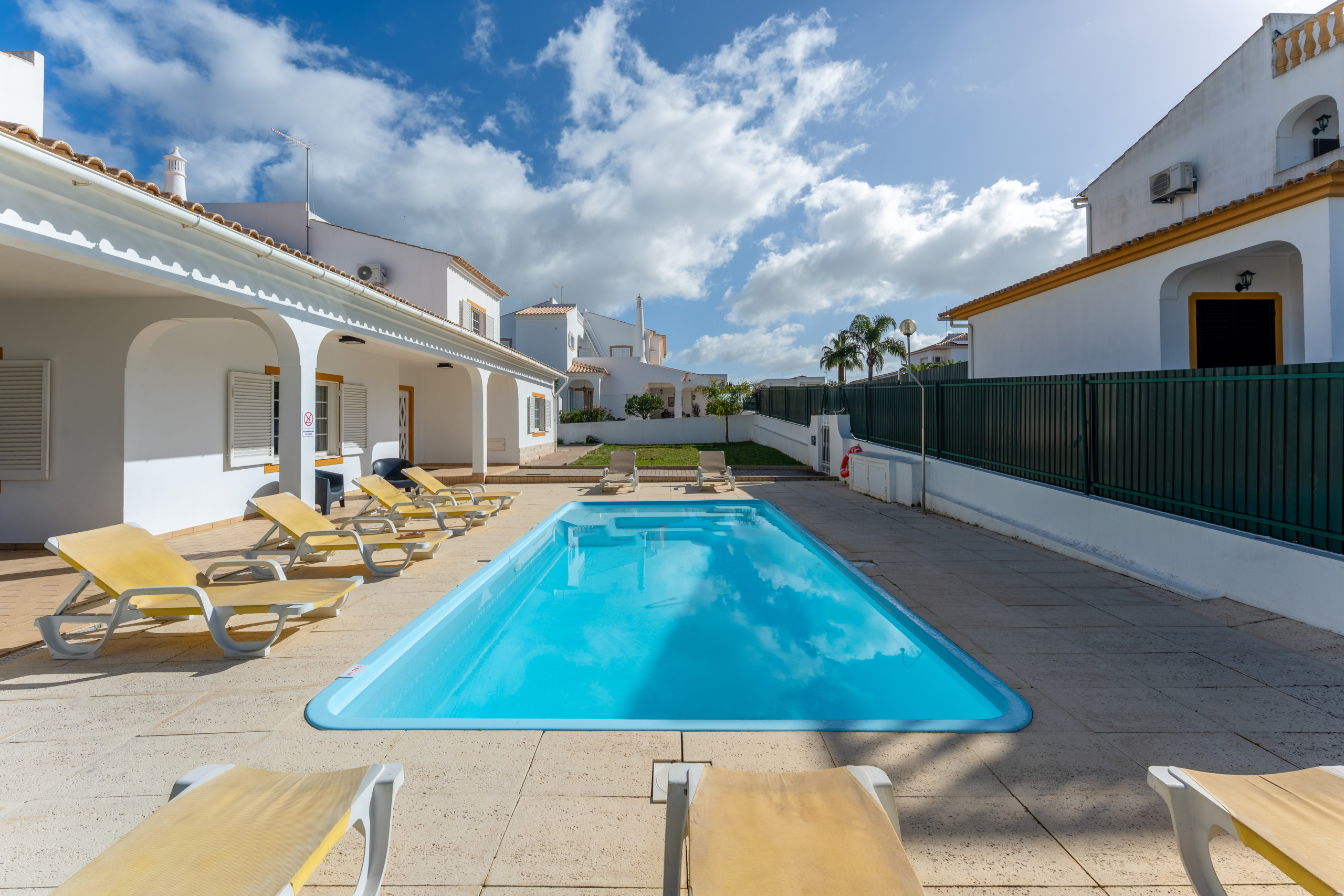 No exterior, a piscina privada, com cerca de 10 espreguiçadeiras, convida a longos dias de sol algarvio. Junto ao barbecue, uma mesa de refeições cria um canto prático e convidativo para almoços ao ar livre e grelhados descontraídos ao fim do dia, depois de explorar a cidade e a costa.