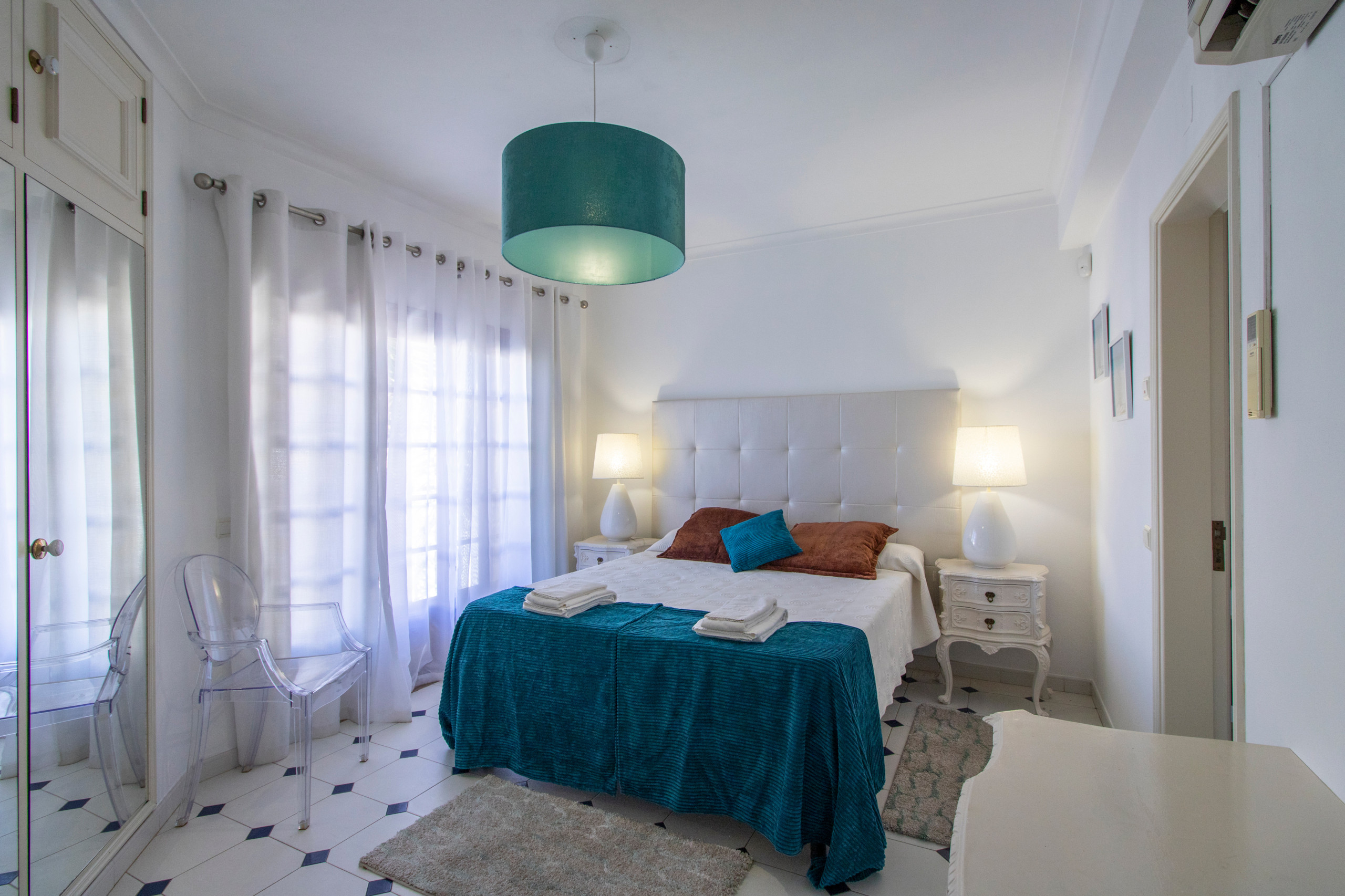 No interior, encontra quatro quartos em suite com ar condicionado — quarto de casal no rés do chão com banheira, quarto com camas individuais no 1.º andar com banheira, quarto de casal com banheira/duche e quarto de casal com duche — mais uma casa de banho de serviço no rés do chão, garantindo espaço privado e confortável para todos. Sem filas nas manhãs de férias!