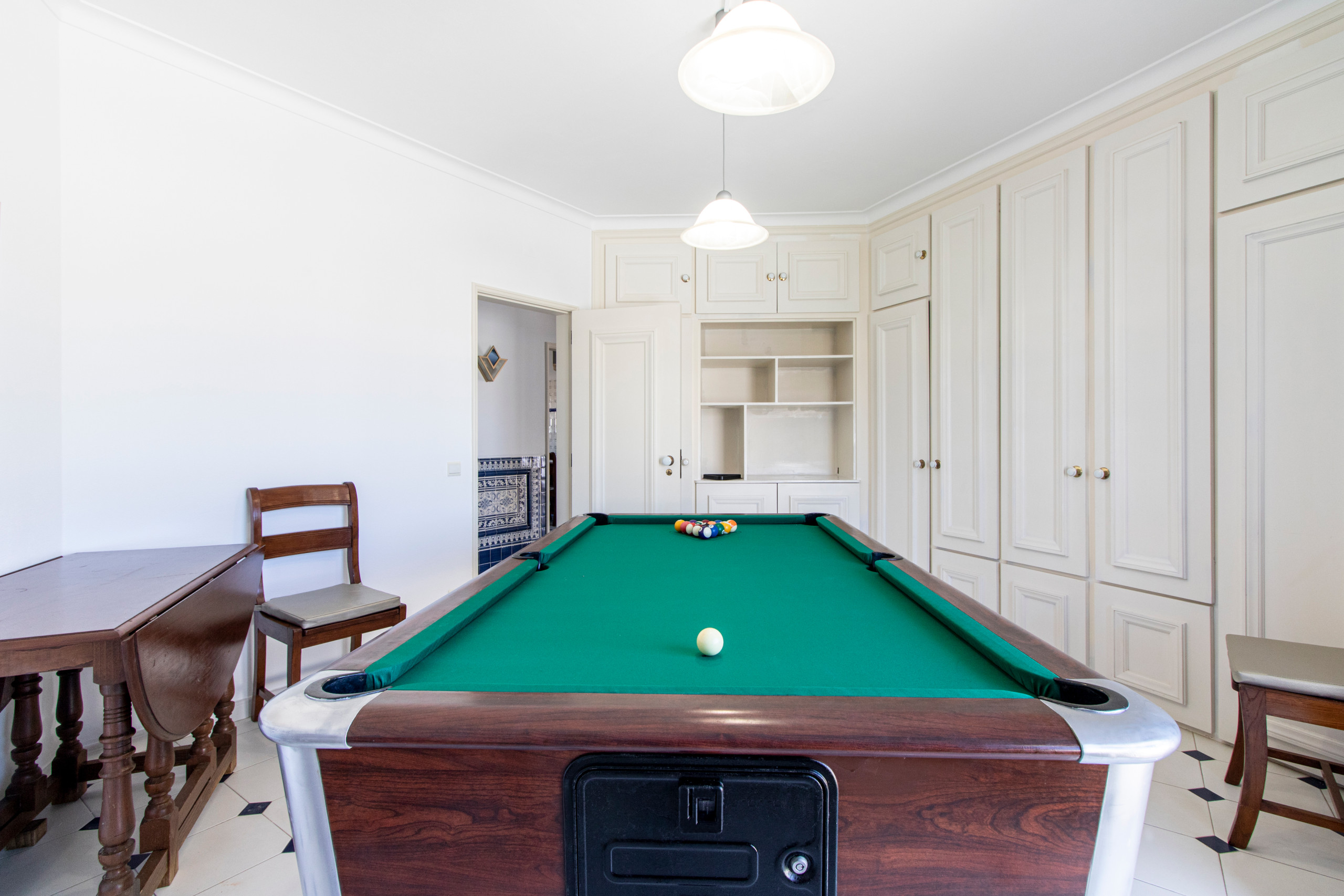 A cozinha independente dispõe de frigorífico, micro-ondas, fogão e máquina de lavar loiça para refeições familiares fáceis. A sala de estar com mesa de jantar oferece espaço para todos, além de uma sala de jogos dedicada com mesa de snooker para diversão indoor.