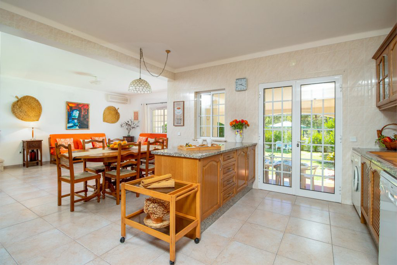 Tem uma espaçosa sala de estar, cozinha e área de jantar em plano aberto, que se abre para o jardim. A cozinha está totalmente equipada e dispõe de uma pequena despensa com um segundo frigorífico combinado, ideal para grupos maiores. A moradia é totalmente climatizada e dispõe de televisão por cabo e internet rápida de fibra.