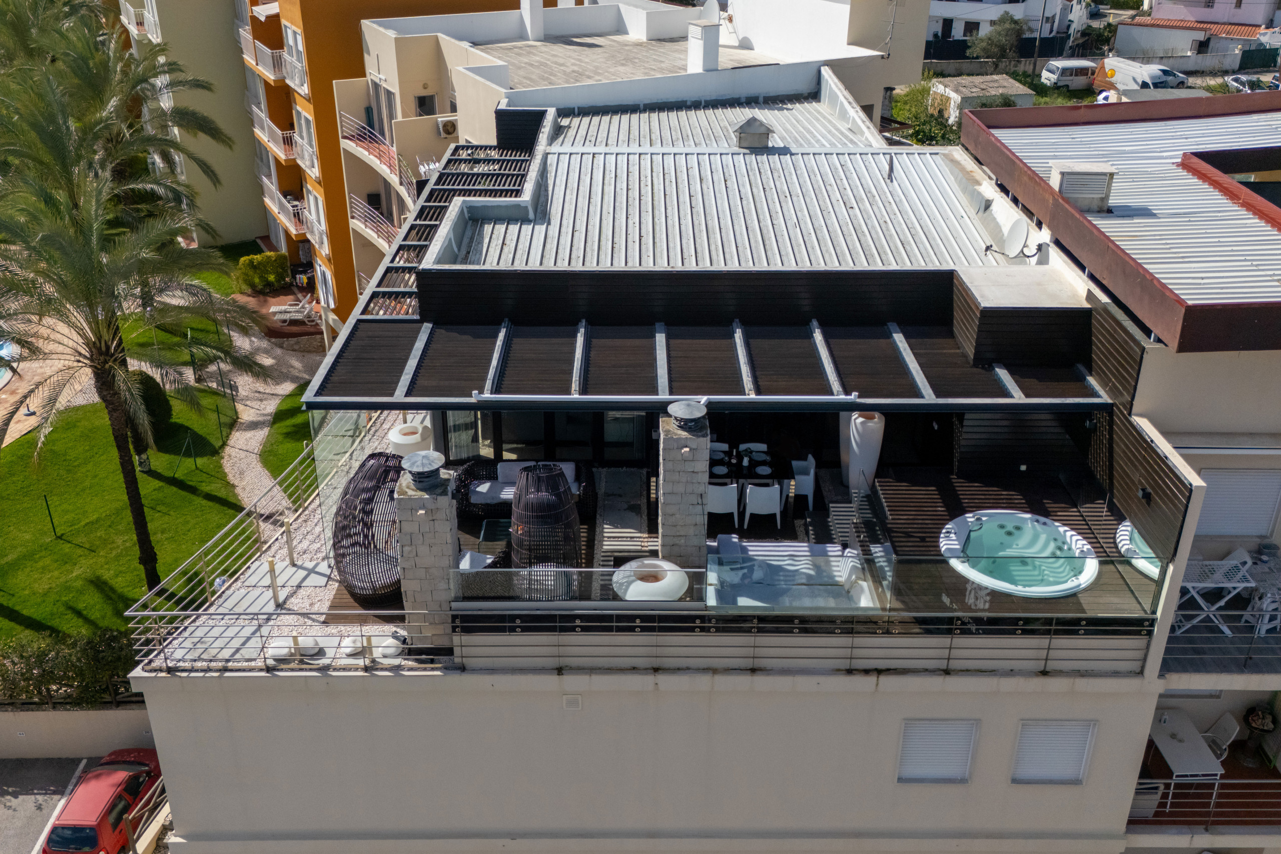 Penthouse Grand Noir is designed for couples seeking tranquillity and comfort, offering the ideal retreat to relax and enjoy time together. Imagine unwinding in the private balcony jacuzzi after sunset drinks, sharing peaceful mornings in the sun, or having a meal al fresco with views of the pool and surrounding skyline. The serene setting encourages moments of connection and calm, with the vibrant atmosphere of Albufeira just around the corner.
