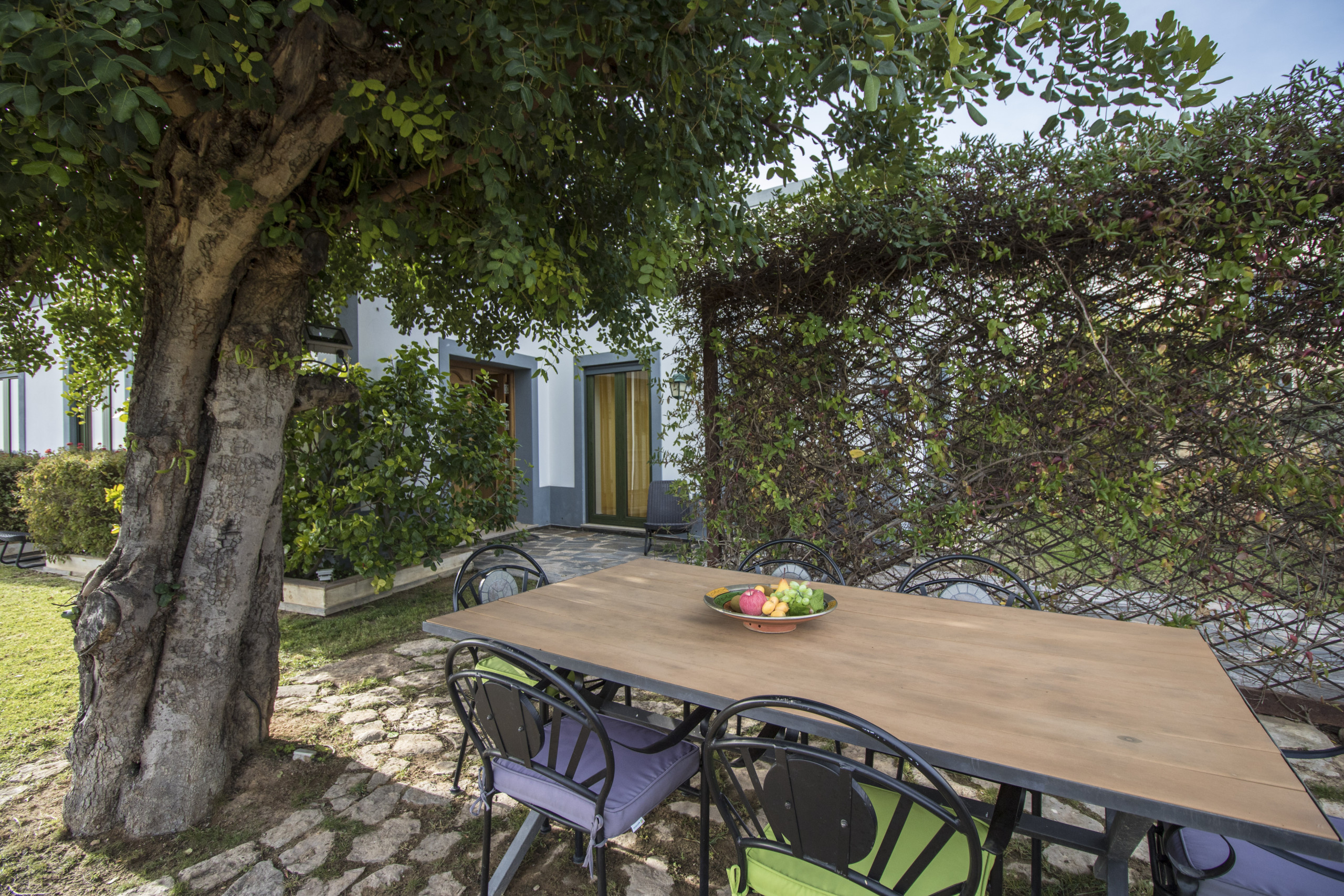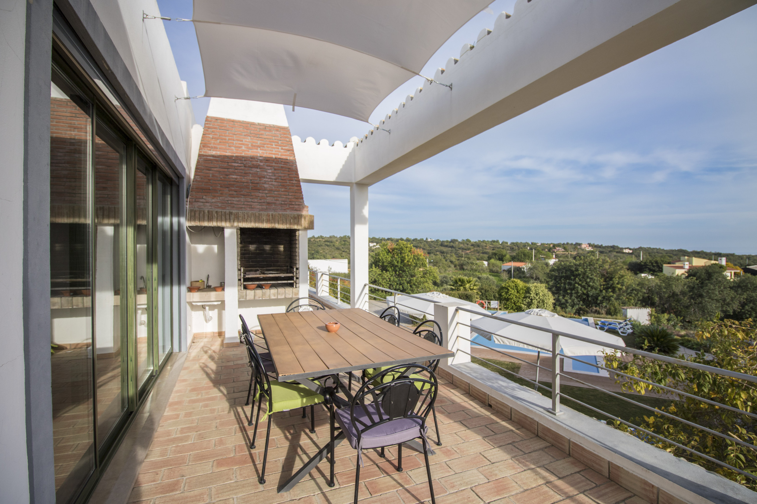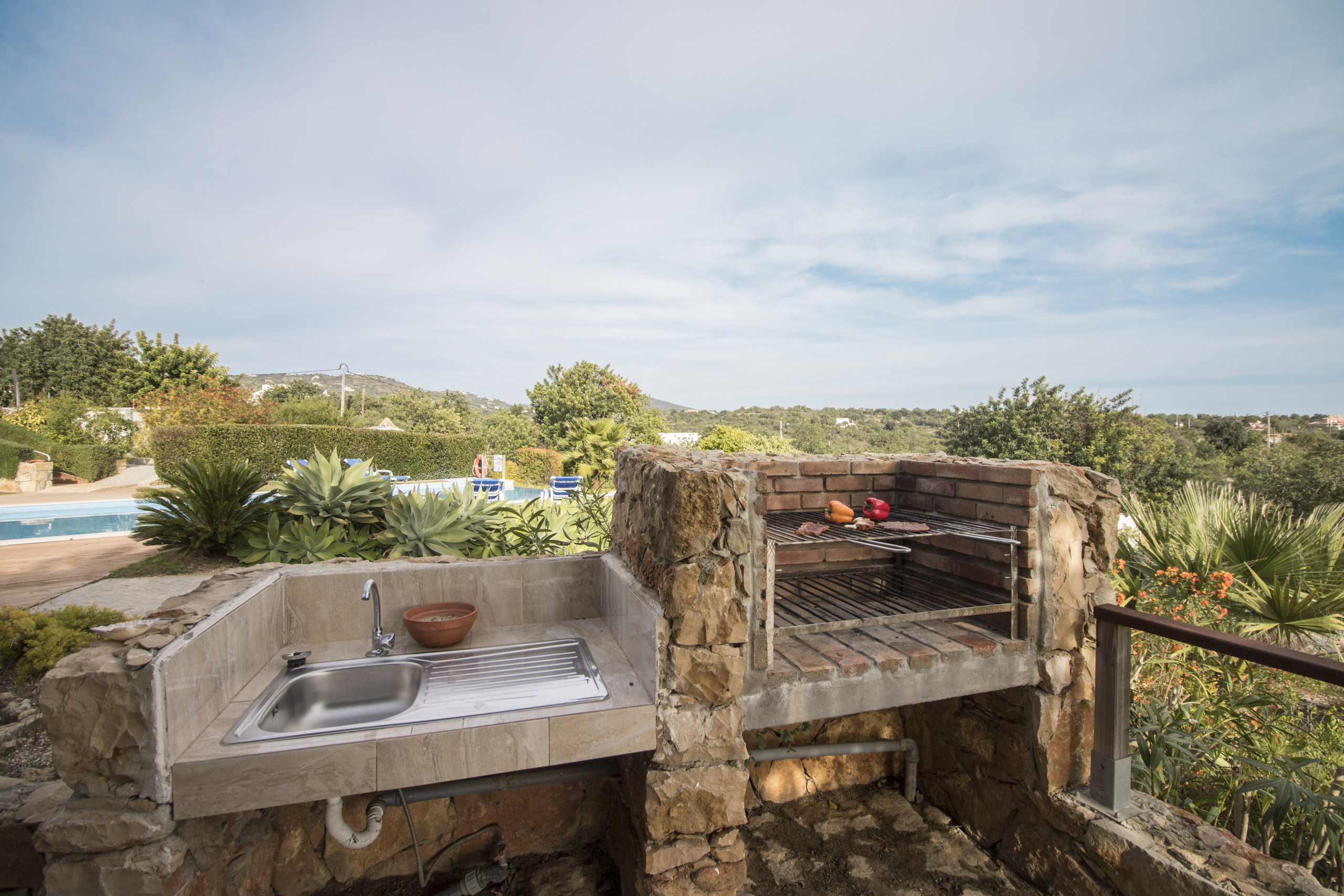 The charcoal barbecue is conveniently placed near the outdoor dining table, together with the rest of the outdoor furniture.