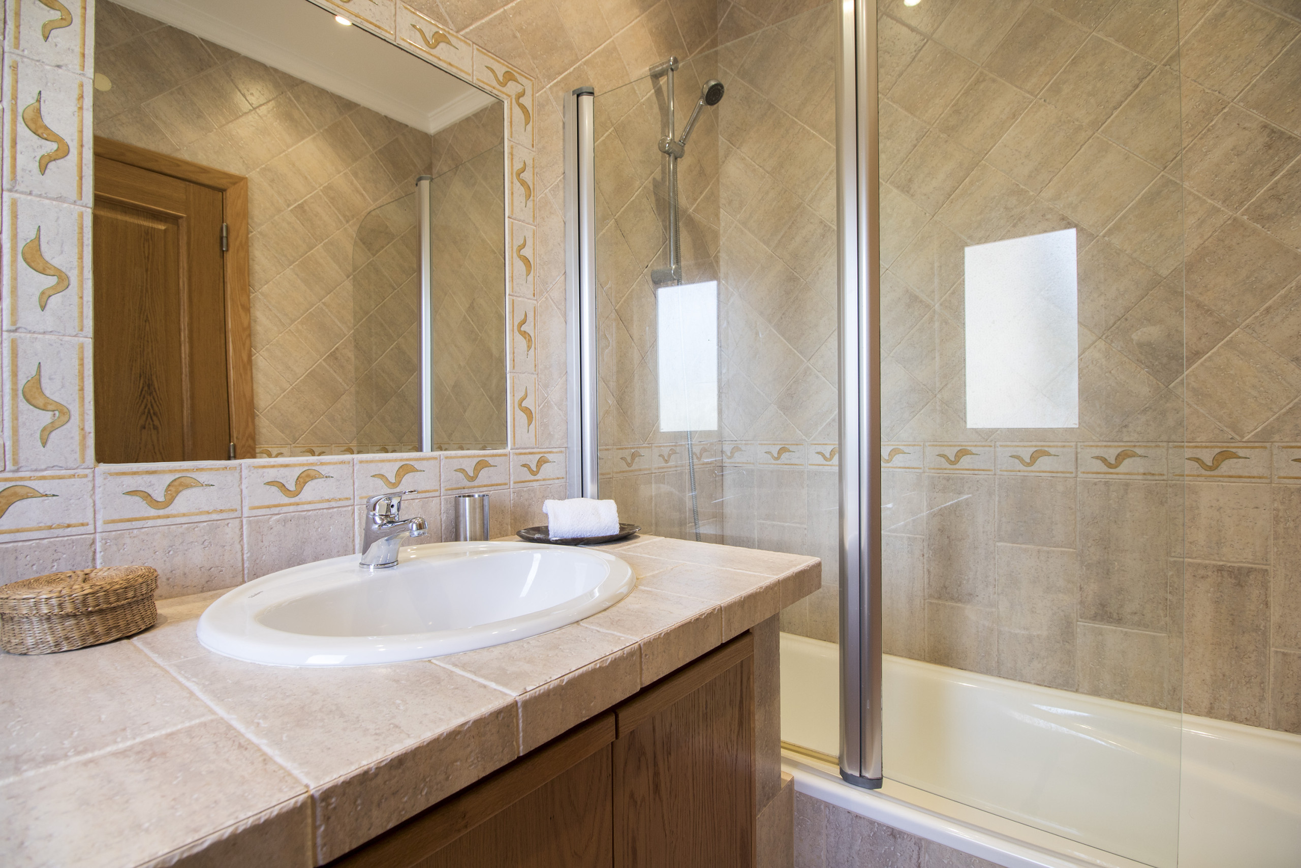 Step inside to three comfortable bedrooms and four bathrooms, giving everyone space and privacy. On the first floor, there’s a double bedroom with en‑suite bathroom with bathtub and air conditioning, plus a second bedroom with bunk bed, en‑suite shower and air conditioning—great for children or friends. On the lower level, you’ll find another double bedroom with en‑suite shower, while a guest WC on the ground floor helps keep busy mornings hassle‑free.