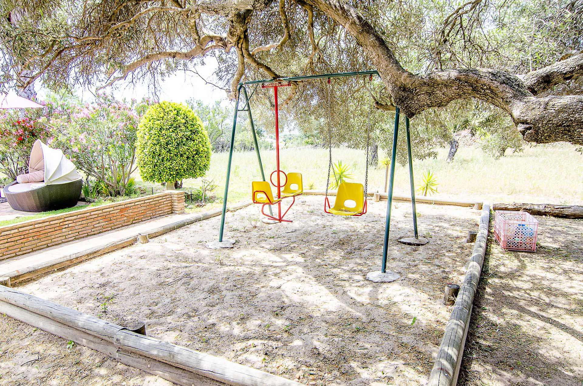 The garden surrounding the house is quite large and flat, offering several different areas of recreation and leisure. The flora is composed of several palm trees, many different shrubs and flower beds, some fruit trees and a large olive tree that provides a refreshing shade over some garden benches and swings.