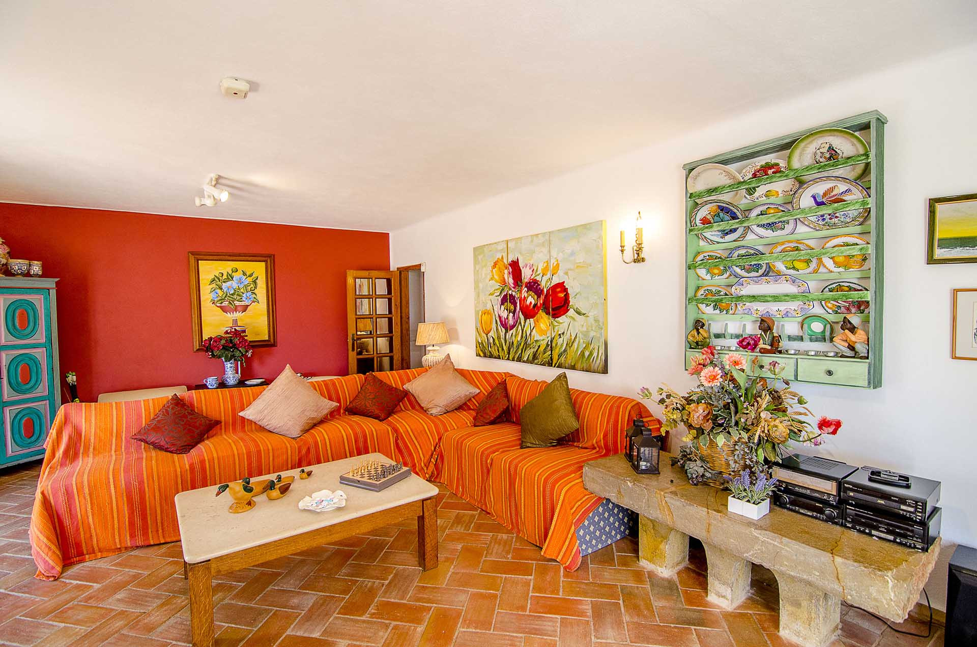 The large main living room, decorated in warm tones, has TV with English spoken channels and internet access via WI-FI. The large sliding doors provide plenty of light to the room as well as a view and access to the garden and the pergola just outside the door.