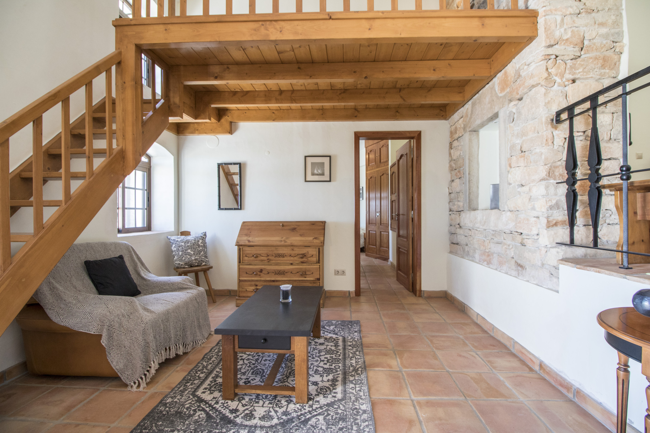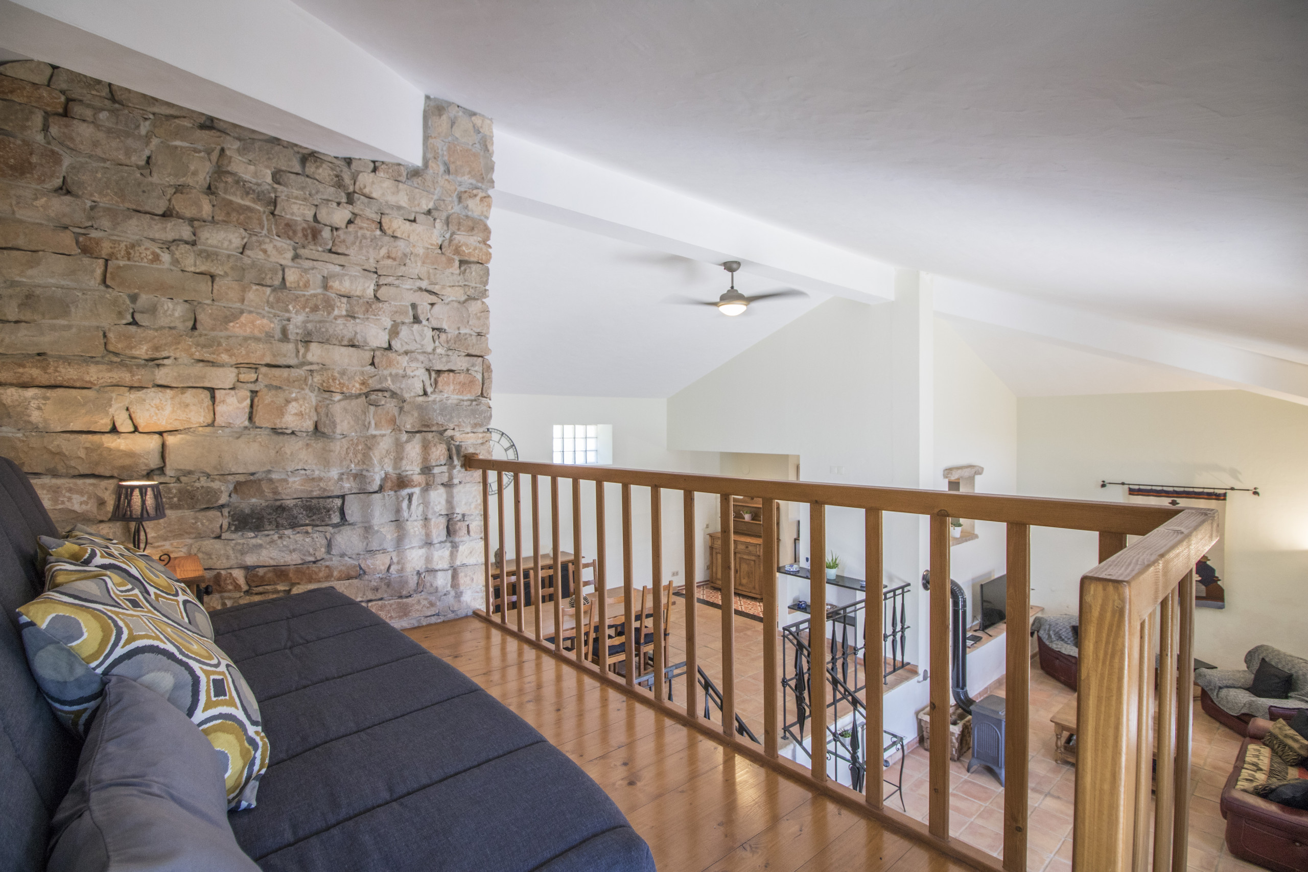 Inside, the villa is bright and welcoming, filled with natural light and built with thick traditional walls that keep it cool on warm days. The layout includes two comfortable double bedrooms, two bathrooms with showers, and a charming mezzanine with a double sofa bed – for extra guests. Fans are provided in every room to keep the atmosphere fresh and pleasant.