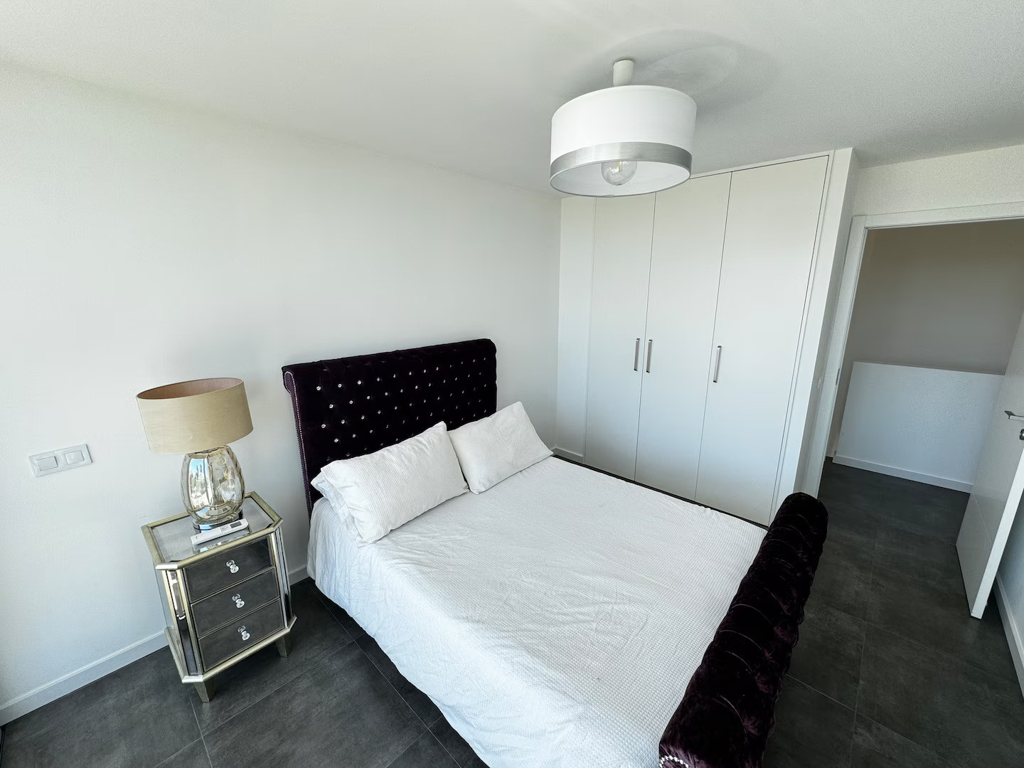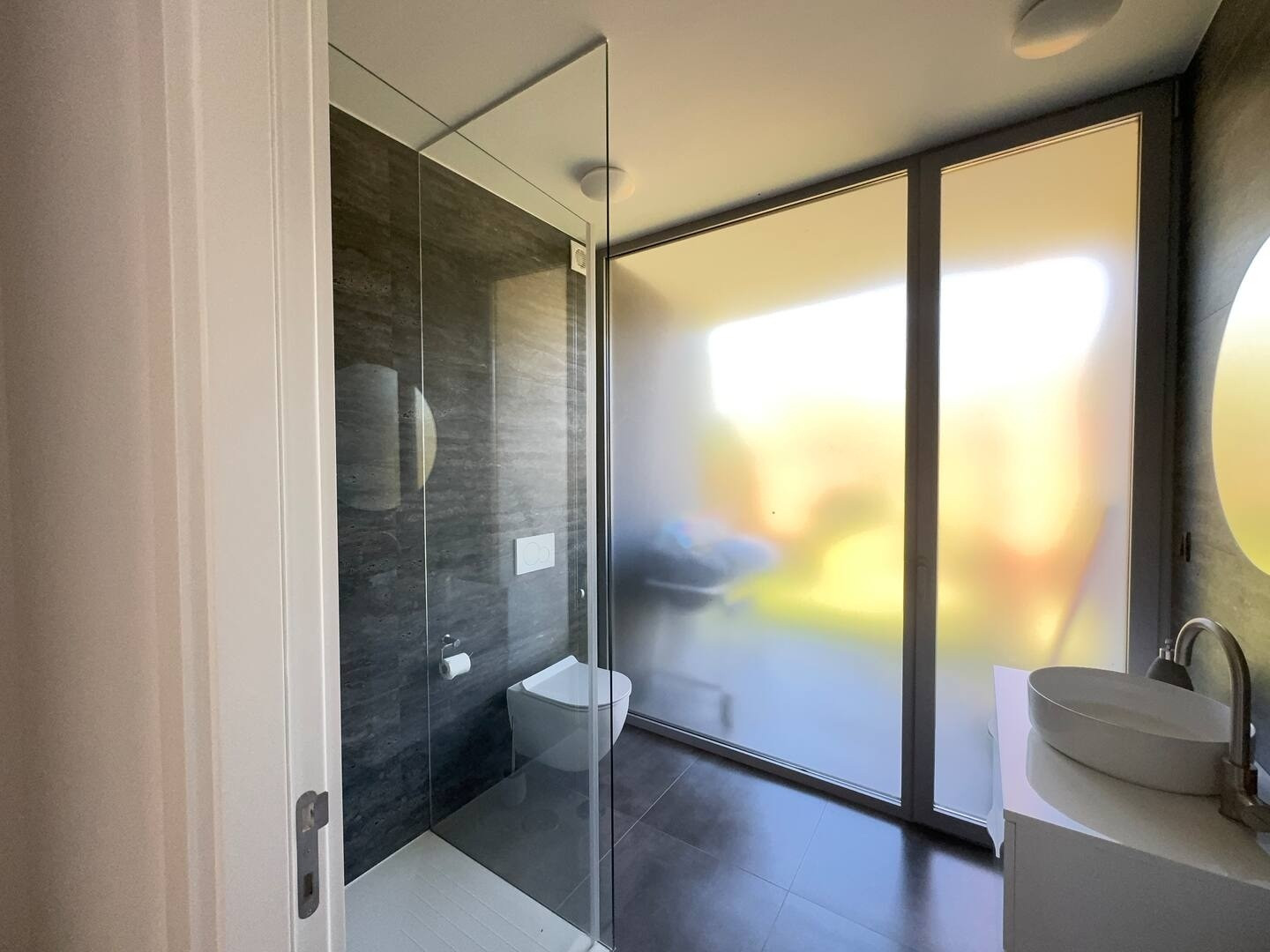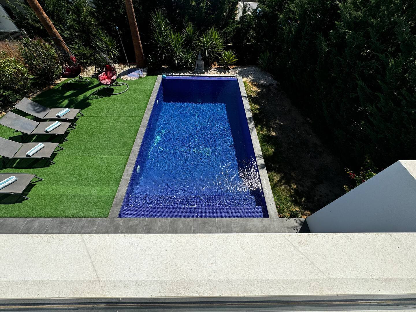 On the ground floor, discover a stylish open-plan kitchen and dining area, filled with natural light from large sliding doors that open directly to the pool. This level also includes a chic bathroom with a shower.