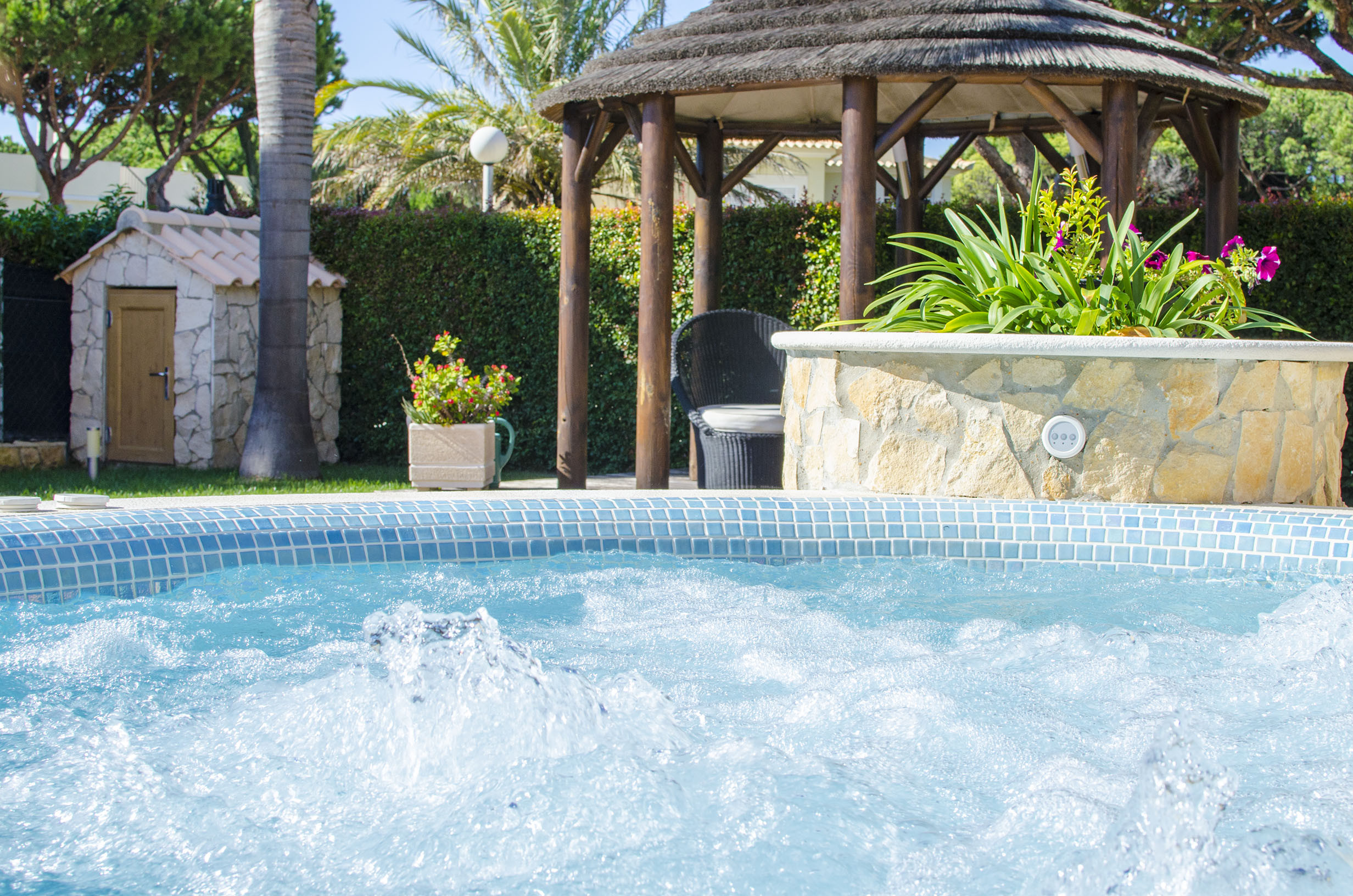 Guests rave about the outdoor haven: 9×5m main pool (1.4m deep) plus shallow kids' pool, heated jacuzzi with jets (heating April–October, 48h notice, extra cost, weather dependent), wooden deck with pergola shade, sun loungers, rattan dining for all, built-in charcoal BBQ, plus putting green and playground with slide/swings. Private and serene.