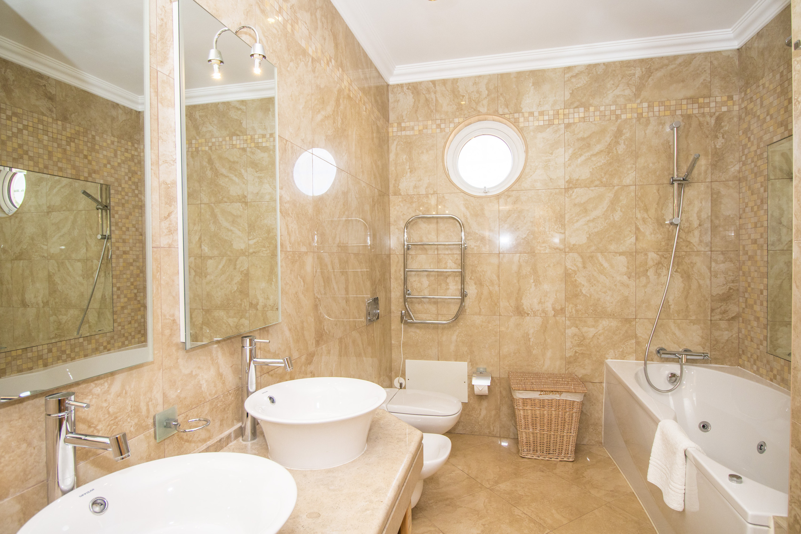 Step inside to six air-conditioned bedrooms and seven bathrooms, spread across floors for privacy and comfort. First floor: main king-size en-suite with jacuzzi tub, plus twin en-suite. Ground floor: double en-suite, twin en-suite, single bedroom with shared bath. Lower floor: another twin en-suite. All bedrooms feature AC for perfect rest.